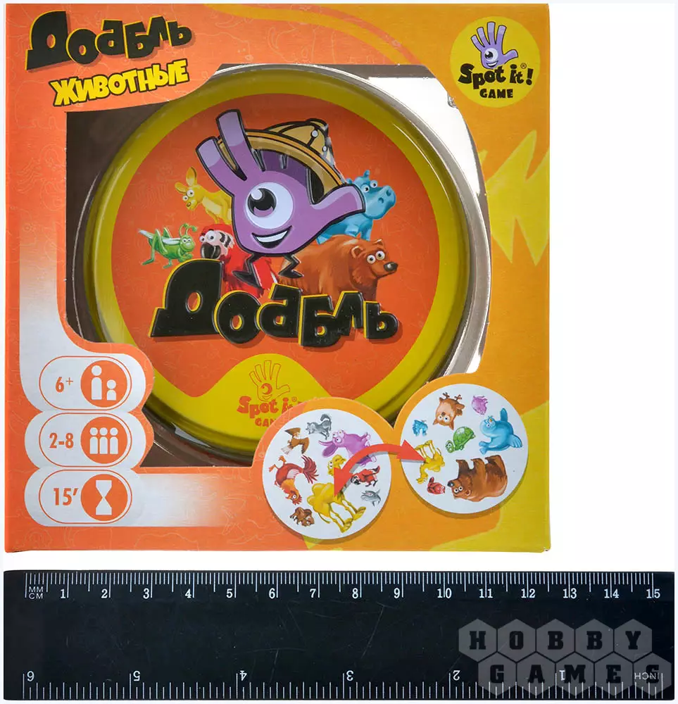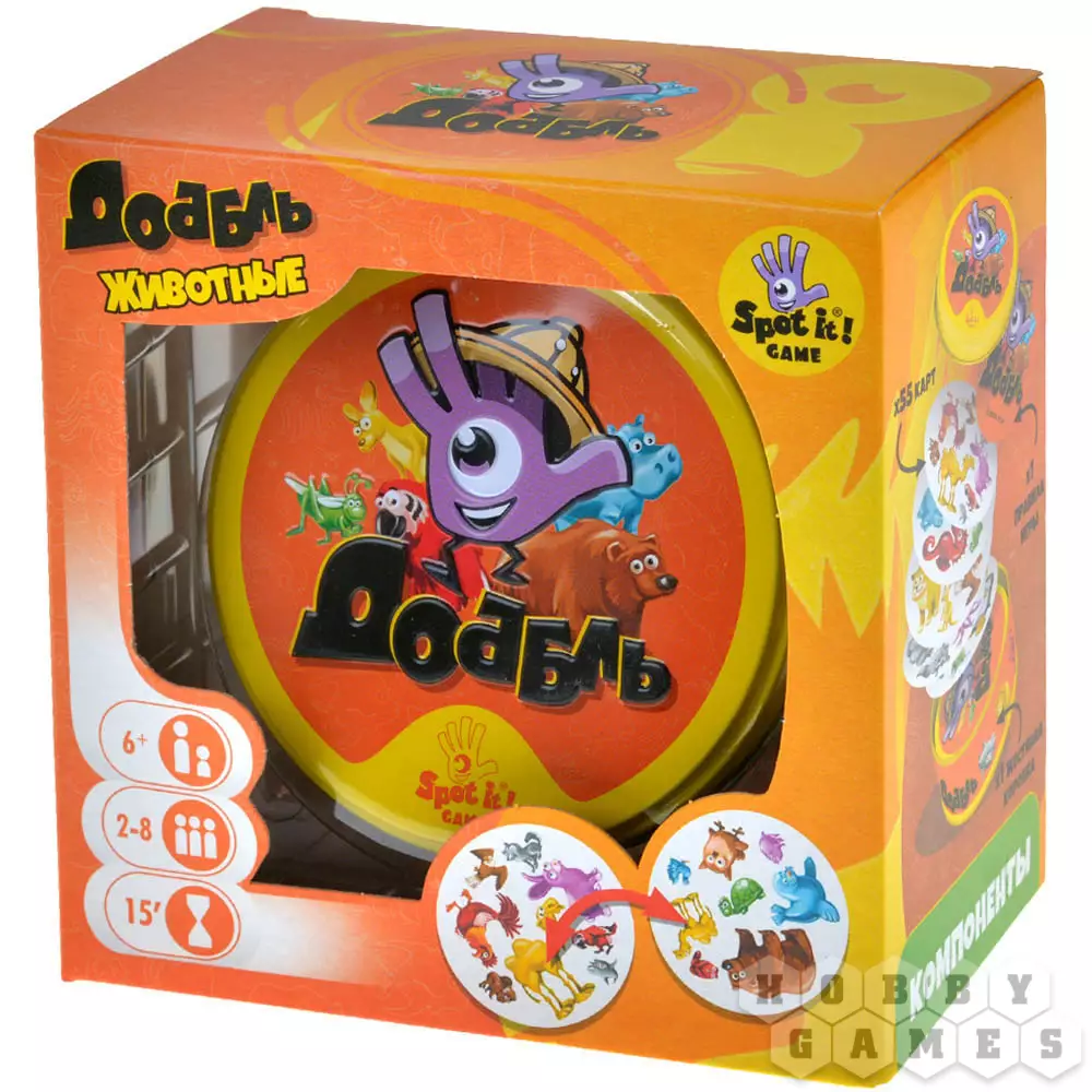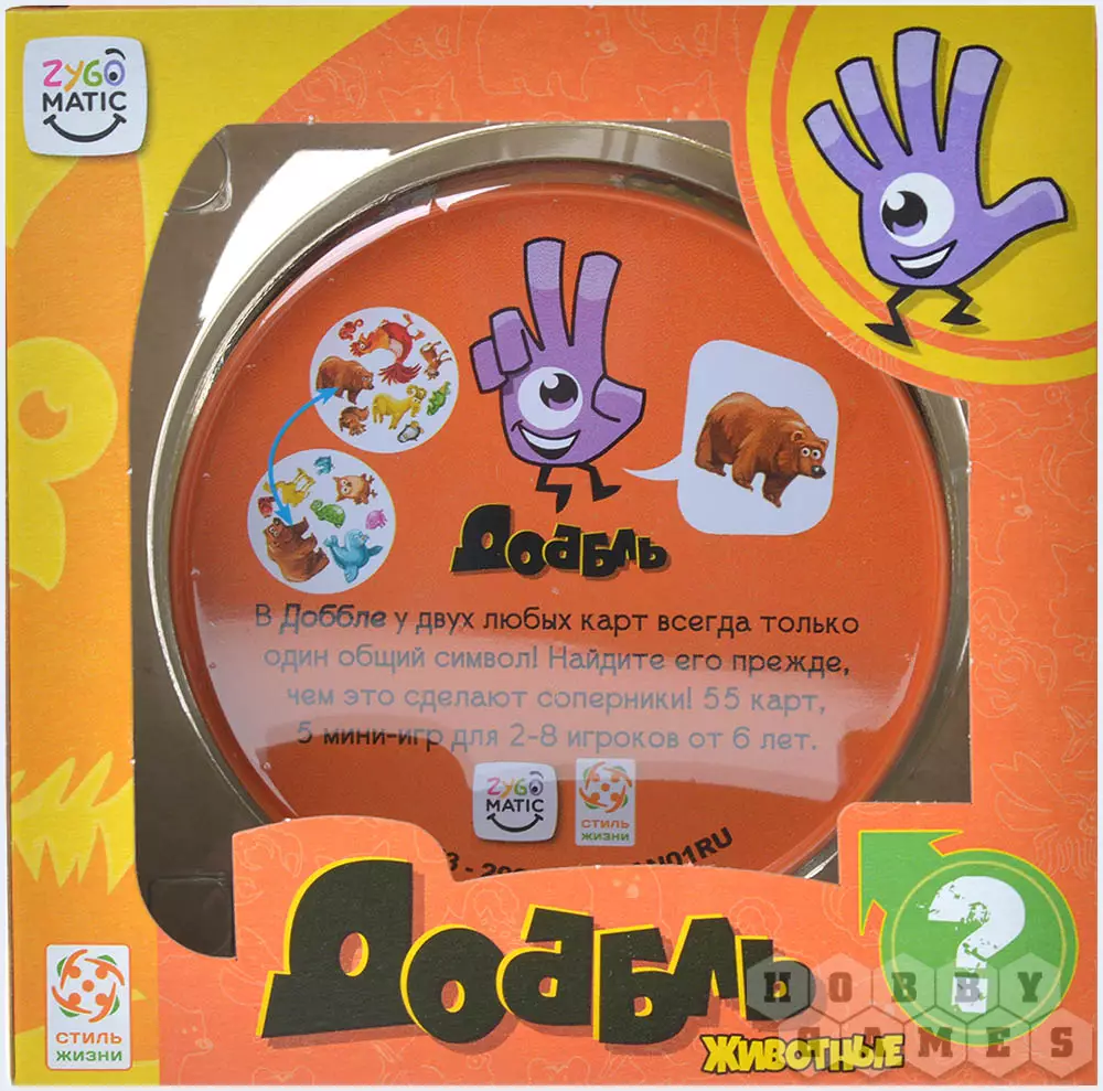 "Доббль: Животные" – это простая, весёлая и азартная игра на внимательность и скорость реакции, которая претерпела уже не одну итерацию, и всё ещё остаётся популярной настолкой! Как бы ни менялось оформление игры "Доббль", в основе её лежит всегда один и тот же принцип – найти на двух разных карточках совпадения быстрее остальных игроков. Именно за эту простоту правил игра и обрела широкую популярность. Посудите сами: легко объяснить детям, ещё и помогает развить внимательность и реакцию, а соревновательный дух поддерживает азарт в каждом игроке. Как можно понять из названия, в этой версии игры вам предстоит искать на карточках совпадающих животных. Нашли двух медведей? Кричите! И пусть победит внимательнейший!