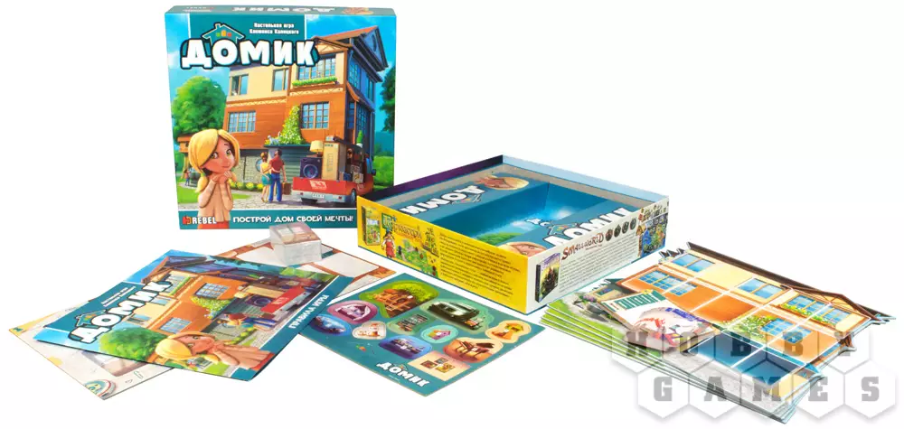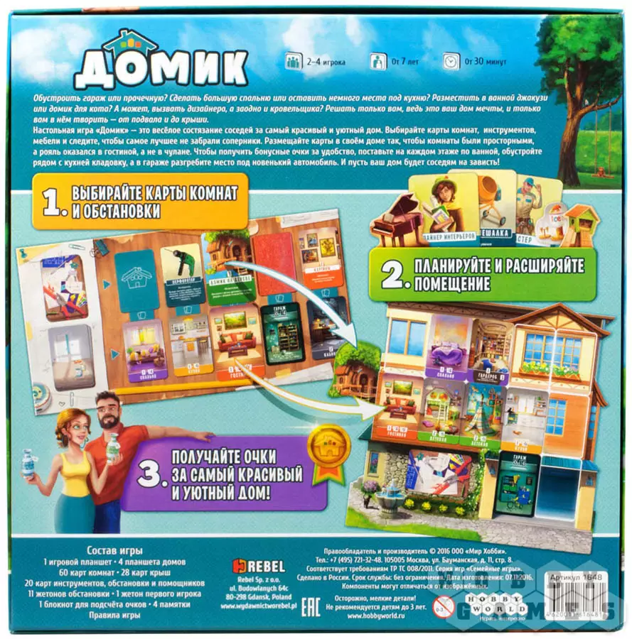 Настольная игра "Домик" – забавная и милая настольная игра для 2-4 игроков на тему строительства своего дома. Выбирайте карты инструментов, мебели комнат и следите, чтобы самое лучшее не досталось соперникам. Размещайте карты в своём доме так, чтобы в комнатах хватало места, а рояль оказался в гостиной, а не в кустах снаружи. Чтобы получить бонусные очки за удобство, обеспечьте каждый этаж ванной, разгребите в гараже место под новенькую машину, а рядом с кухней устройте кладовку. И пусть ваш дом будет самым уютным и удобным!