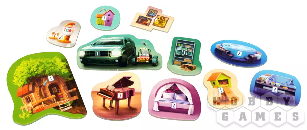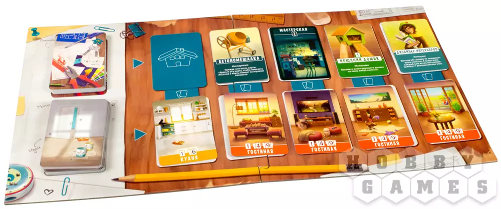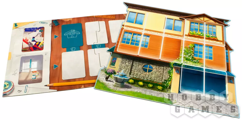 Перед игроками находится планшет с ячейками для карт в два ряда. В верхнем ряду лежат карты ресурсов, а в нижнем – карты комнат. Помимо этого, каждый игрок получает планшет с макетом дома. Дом состоит из трёх этажей и крыши. Ваша задача – построить дом своей мечты и заработать как можно больше победных очков. Делается это за счёт эффективного строительства комнат, расположения в них различных предметов интерьера и т.д.