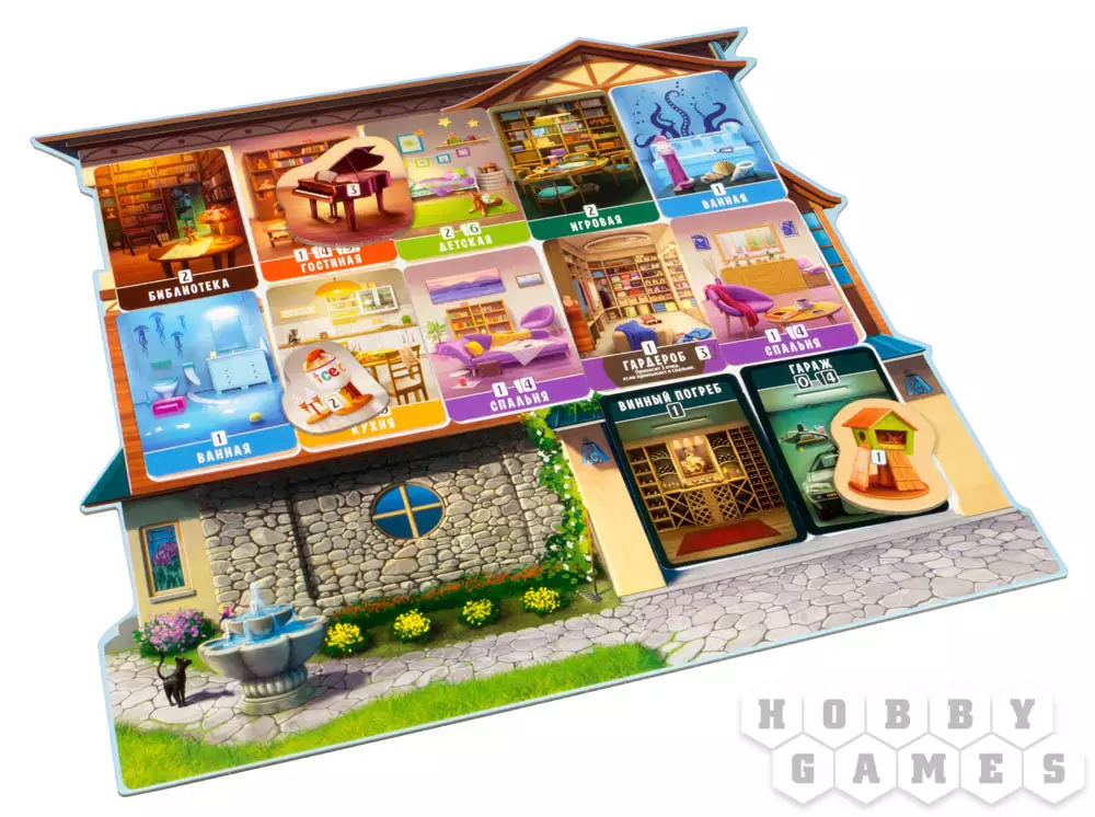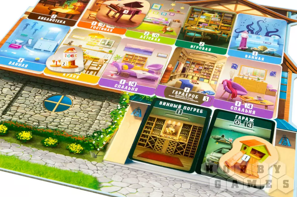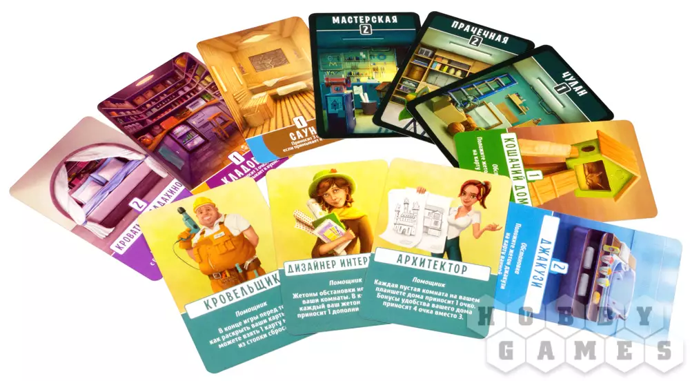 Бонусы помощников – эти карты предлагают уникальные способности в конце игры. Например, курьер позволяет взять одну карту комнаты из стопки сброса и заменить ей одну из своих комнат, а архитектор добавит очки за удобство дома.