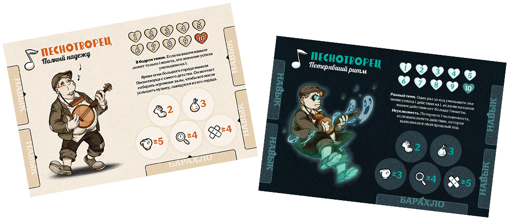 Разложите их на навыки и основные действия. Помните: на навык можно положить монету, только если в прошлом раунде её там не было