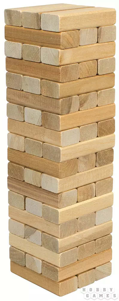 Соберите деревянную башню и одной рукой тяните из неё по очереди по одному бруску, не трогая два верхних уровня. Вытянутый брусок необходимо поставить на самый верх конструкции. После чего ход переходит к следующему игроку. И так ход за ходом до тех пор, пока ваше совместное творение не рассыпется по всему столу. Тот из игроков, от чьей нетвёрдой руки рухнула ваша башня, объявляется проигравшим и выстраивает конструкцию заново для следующей партии.