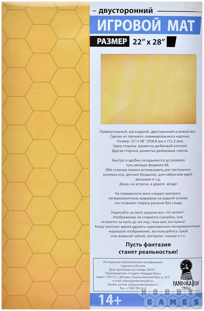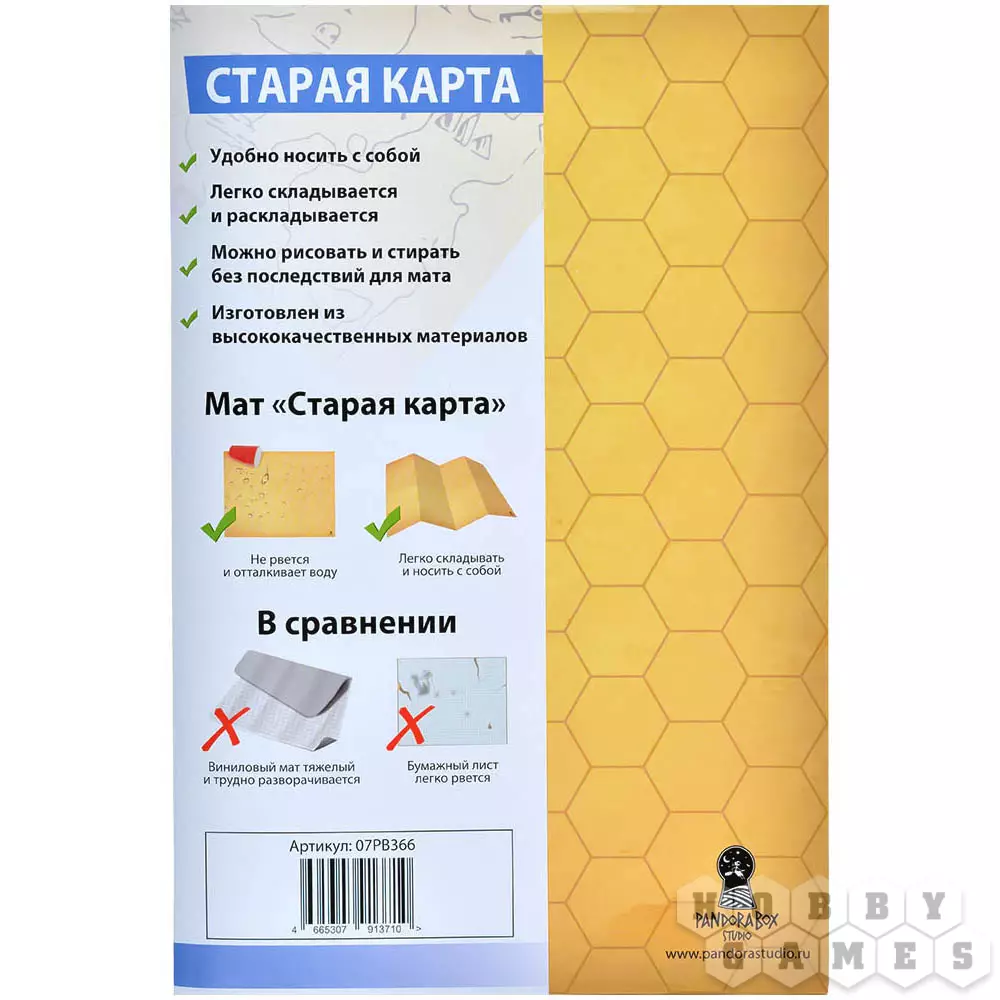 Этот игровой мат – отличное приспособление для настольных ролевых игр. Деталей ландшафта всегда будет недостаточно, и неплохой выход из этой ситуации – игровое поле, на котором можно нарисовать всё необходимое. Двухсторонняя ламинация мата не только защищает его от воздействия воды или грязи, но и позволяет бесследно стирать нарисованные неперманентным маркером схемы ландшафта. Для удобства транспортировки его легко сложить до формата А4. На одной стороне мата нанесены гексы, а на другой – сетка. Это очень удобно и повышает области использования данного мата.