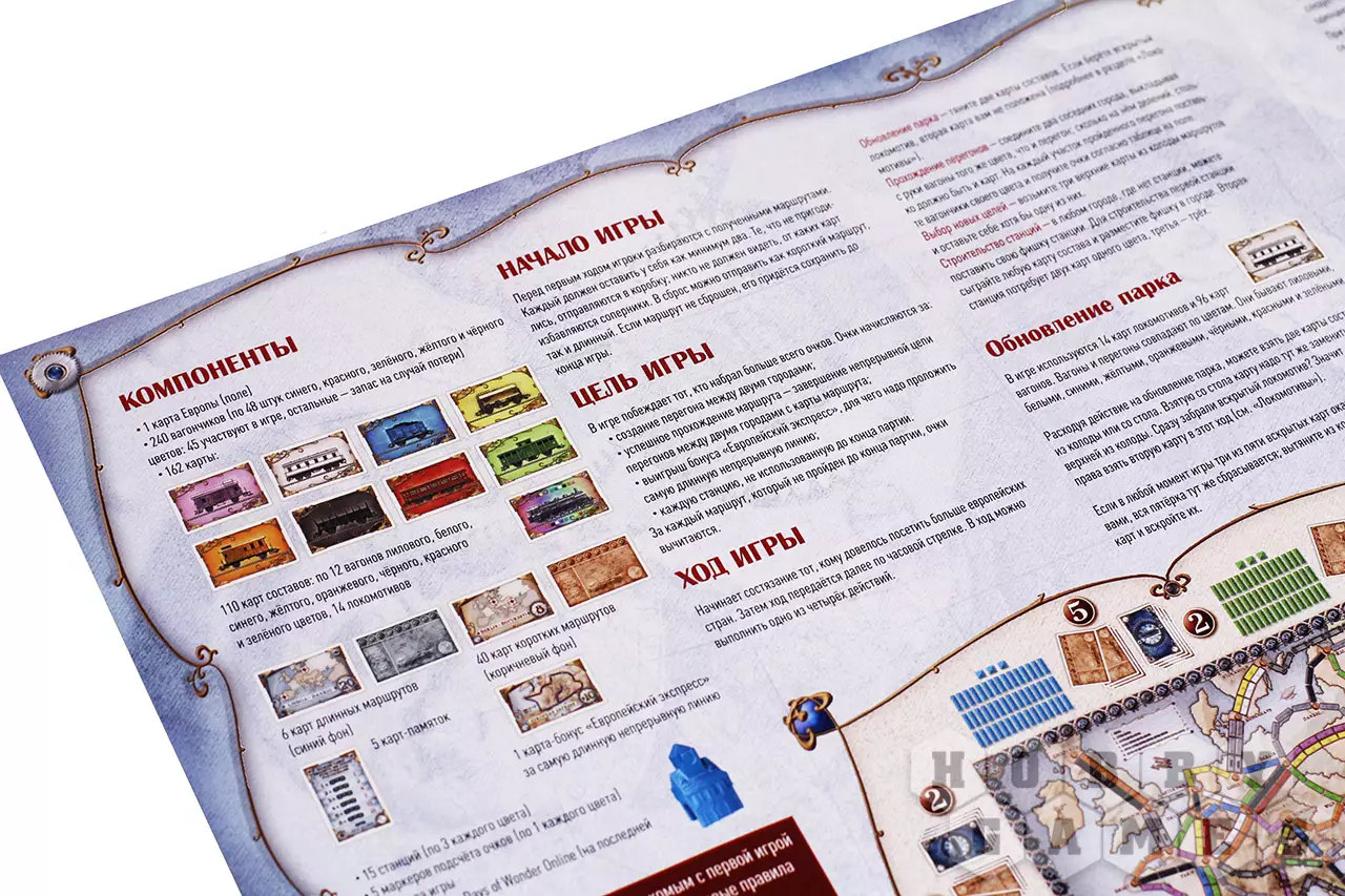 Итак, что нового? Игрокам предлагается новая карта с яркими иллюстрациями, наполненная уникальными элементами (паромами и тоннелями). К карте прилагаются маршруты. Среди новинок следует выделить железнодорожные вокзалы, наличие обязательных маршрутов дальнего следования и обновленные правила.