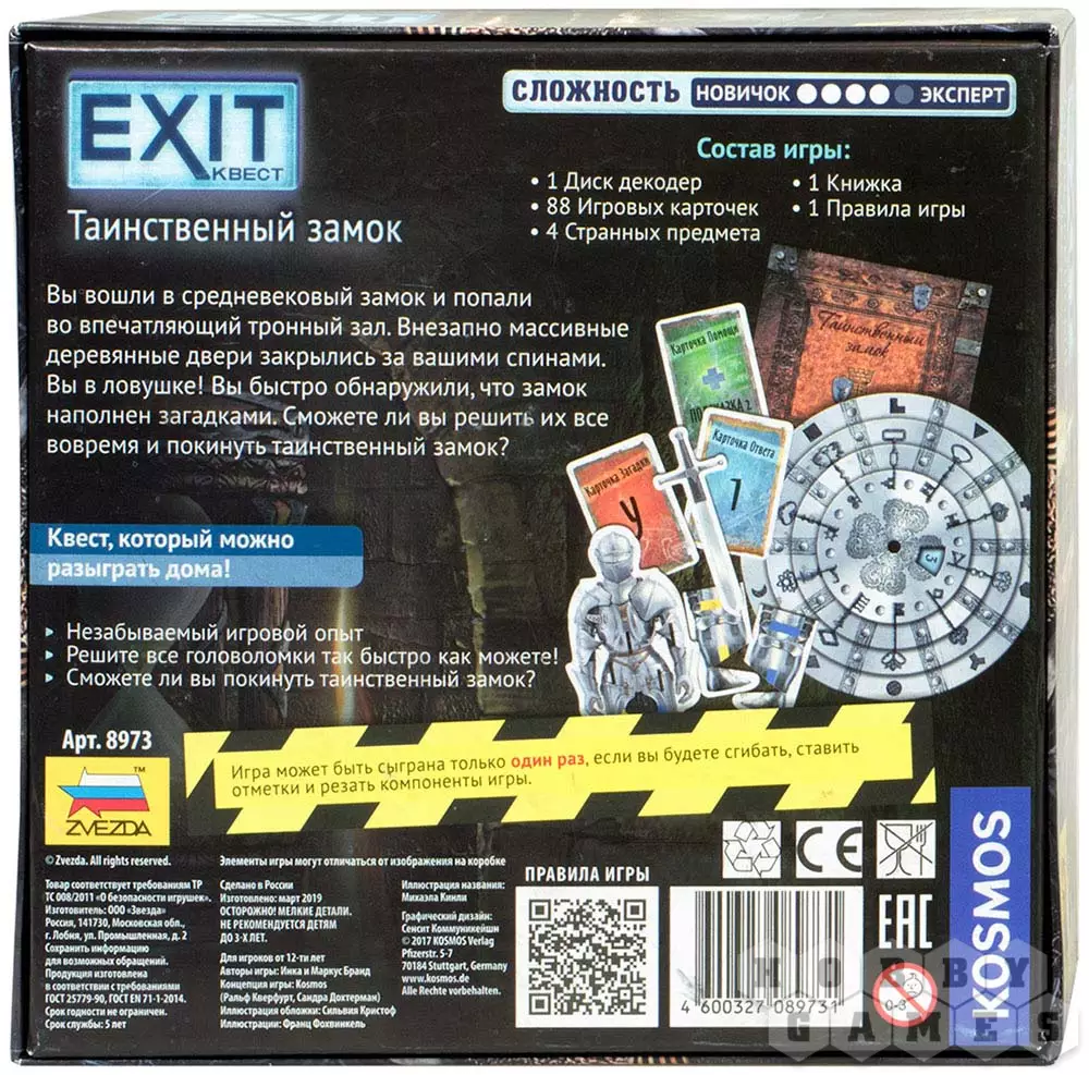"EXIT-Квест: Таинственный замок" – это не совсем настольная игра, за основной механизм игры взяты "эскейп-квесты" – приключенческие игры, проходящие в реальной жизни. Этот популярный жанр получил своё развитие и на игровых столах. Перед игроками ставится задача – покинуть определённое место и попытаться выбраться из опасной ситуации, не попав в ловушку. Серия игр "EXIT-Квест" предлагает игрокам целый ряд интеллектуальных и логических задач, которые станут занимательным развлечением на вечер.