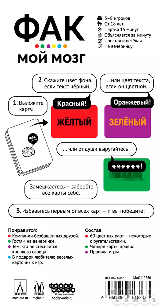 Неважно, слышали ли вы про эффект Струпа или нет. Напомним, так называется процесс затруднения во время называния цвета слов, значение которых с ним не совпадает. Именно это стало основой настолки "Фак мой мозг". В процессе игры вам предстоит говорить, например, "зелёный", хотя написано будет "фиолетовый", или же "красный", когда написано "жёлтый". Да, и чуть не забыли – приготовьтесь в любой момент от души нецензурно выругаться! Так что если кто-нибудь из вашей компании вдруг стесняется крепкого словца, предупредите об этом перед началом партии!