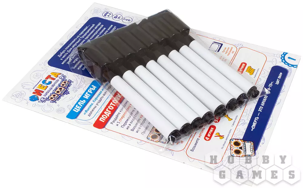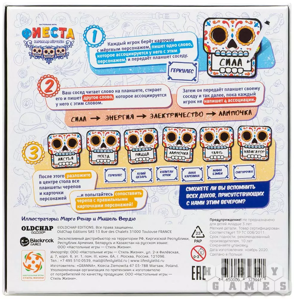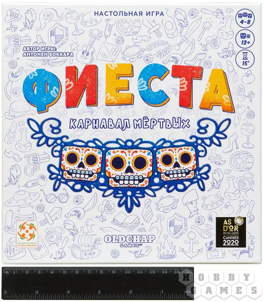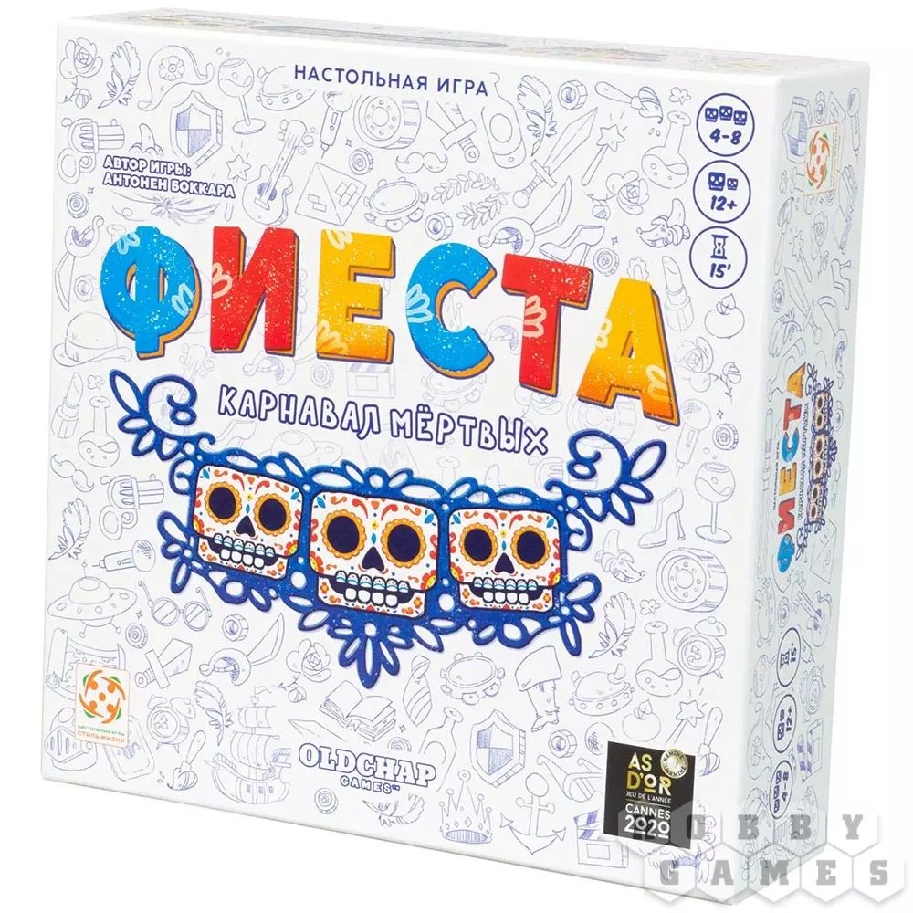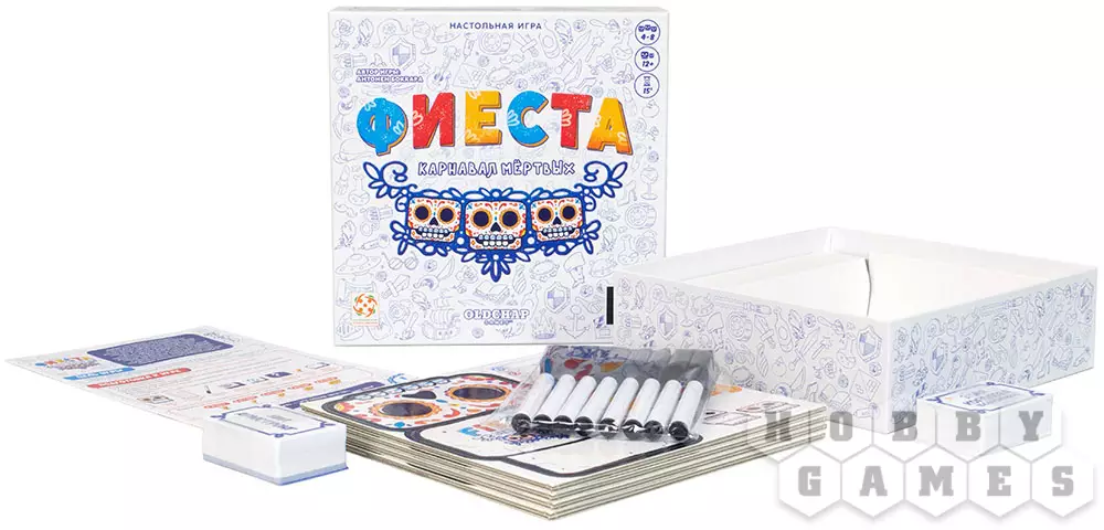 "Фиеста. Карнавал мёртвых" – это настольная игра для вечеринки, участники которой действуют заодно, используя как возникающие у них ассоциации, так и обычную логику. Игрокам предстоит отгадать знаменитых персонажей из истории, литературы, мифологии и не только по ассоциируемому им слову – но не по простой ассоциации, а по искажённой "испорченным телефоном". Игра рассчитана на компанию от 4 до 8 человек и сделает вашу вечеринку ещё веселее – а заодно поможет получше узнать друг друга.
