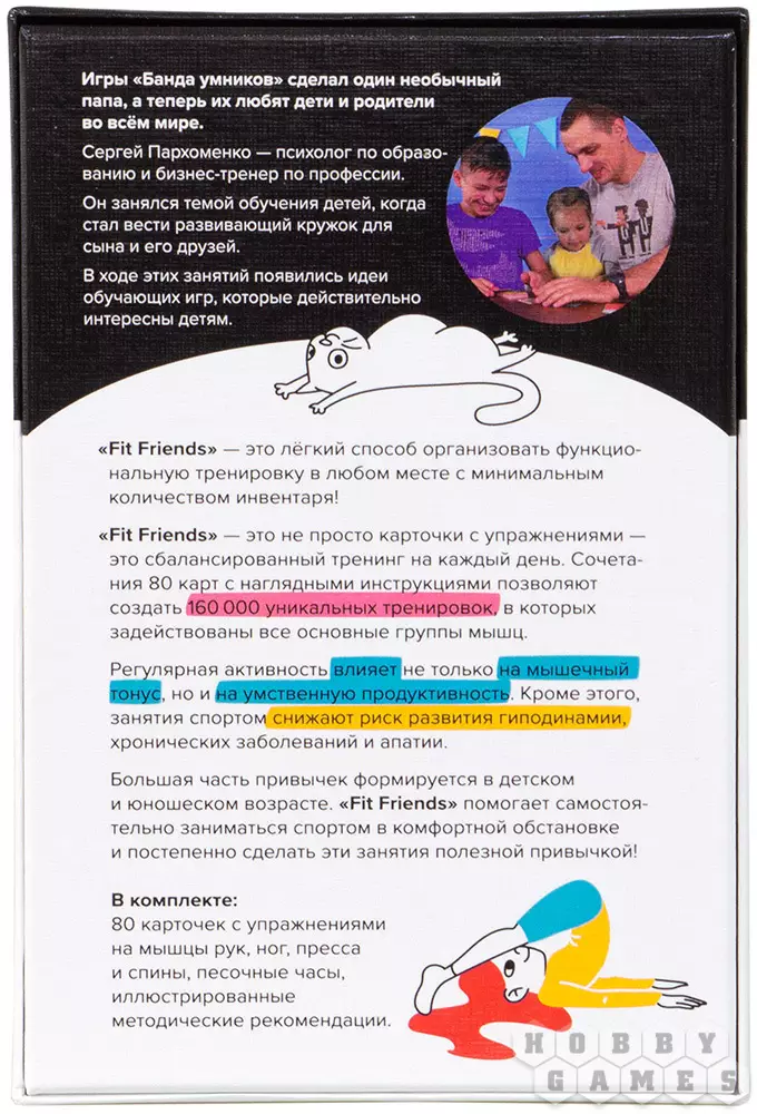 "FIT friends" – это упражнения на каждый день! В наборе 80 карт с уникальными упражнениями и наглядными примерами по выполнению. Этот комплект карт и их комбинации позволят создать неограниченное количество тренировок различного уровня сложности и для каждой группы мышц. Небольшая коробка удобна для транспортировки, карты можно взять с собой и заниматься где угодно, хоть дома, хоть на свежем воздухе!