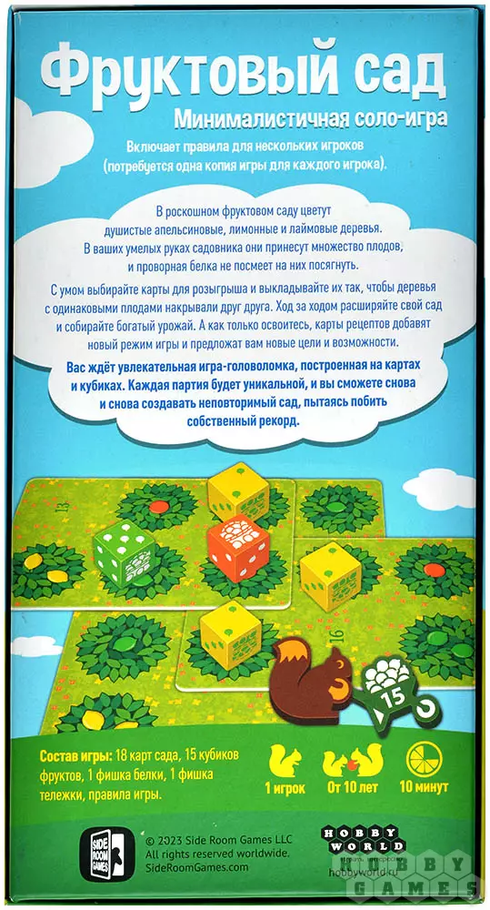 "Фруктовый сад" – это настольная игра-головоломка для одного игрока с очень простыми правилами. Игровой процесс достаточно глубок, но в то же время медитативен: используя карты с деревьями, вам предстоит создать свой уникальный фруктовый сад и постараться сделать его максимально урожайным. Каждая партия во "Фруктовый сад" будет уникальна, поэтому вы никогда не создадите два одинаковых сада. И тем интереснее будет раскладывать игру вновь и вновь, чтобы побить свой рекорд!