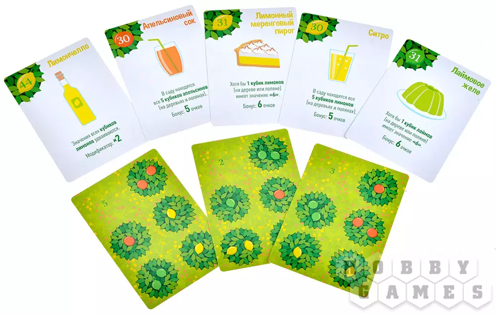 Помимо фруктовых деревьев на картах есть и пустые поляны, которыми можно накрывать фруктовые деревья, а это неплохой способ подготовить сад к новому участку! А ещё можно сыграть в режим с рецептами, которы изображены на обороте карт деревьев. При подготовке к игре просто отложите в сторону 2 карты рецепта, на них будут указаны условия получения бонусных очков, а сумма чисел в верхней части рецептов означает вашу цель в победных очках.