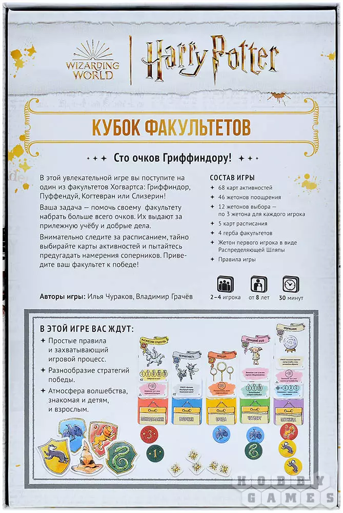 Ваша цель – привести свой факультет к победе, набрав наибольшее количество очков. Но путь к триумфу лежит не только через прилежную учёбу, но и через добрые дела и хитроумные ходы. Следите за расписанием уроков, выбирайте карты активностей и старайтесь предугадать ходы своих соперников. Каждое ваше действие может стать решающим на пути к заветному Кубку факультетов!