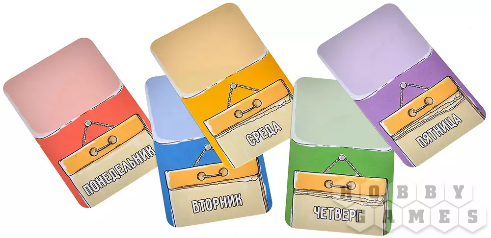 Разбираем карты активностей, не толкаемся! Первый игрок переворачивает все жетоны под понедельником. Владельцы жетонов разбирают карты активностей с понедельника по правилам игры. Этот процесс повторяется день за днём, пока все дни недели не окажутся расписанными и разобранными.