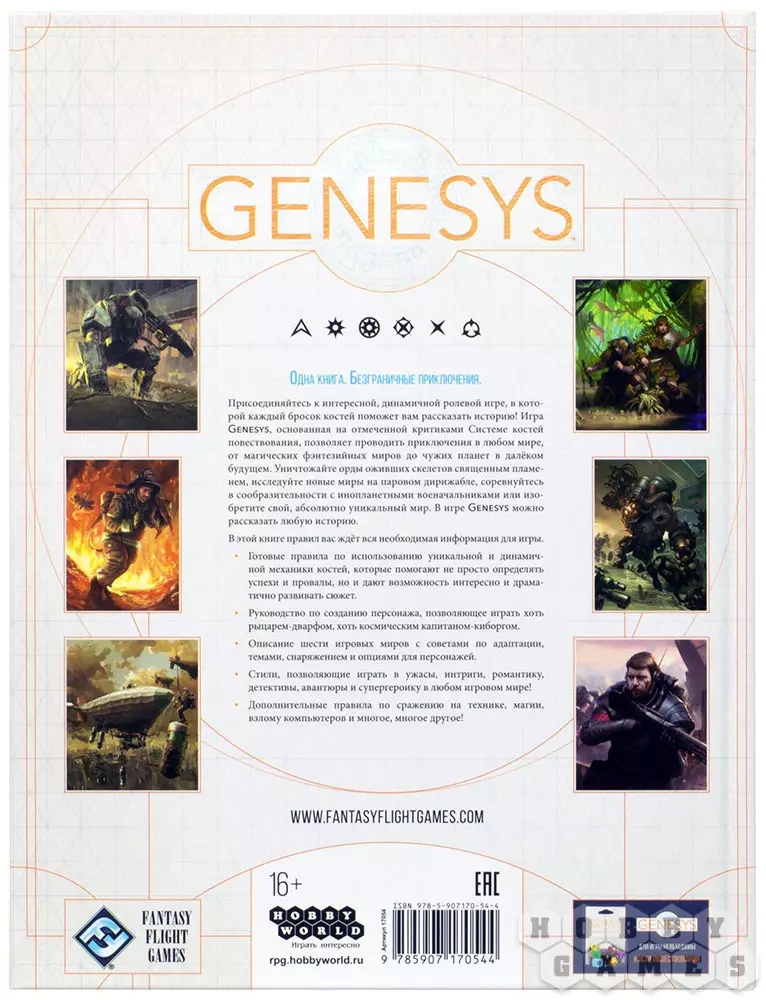 Перед вами основная книга правил для ролевой игры Genesys. Хотя, если точнее, то это целая ролевая система, которая может подстроиться под различные сеттинги, в зависимости от выбора игрока. Это может быть как мир фэнтези или стимпанка, так и ближайшего будущего или же настоящего времени.