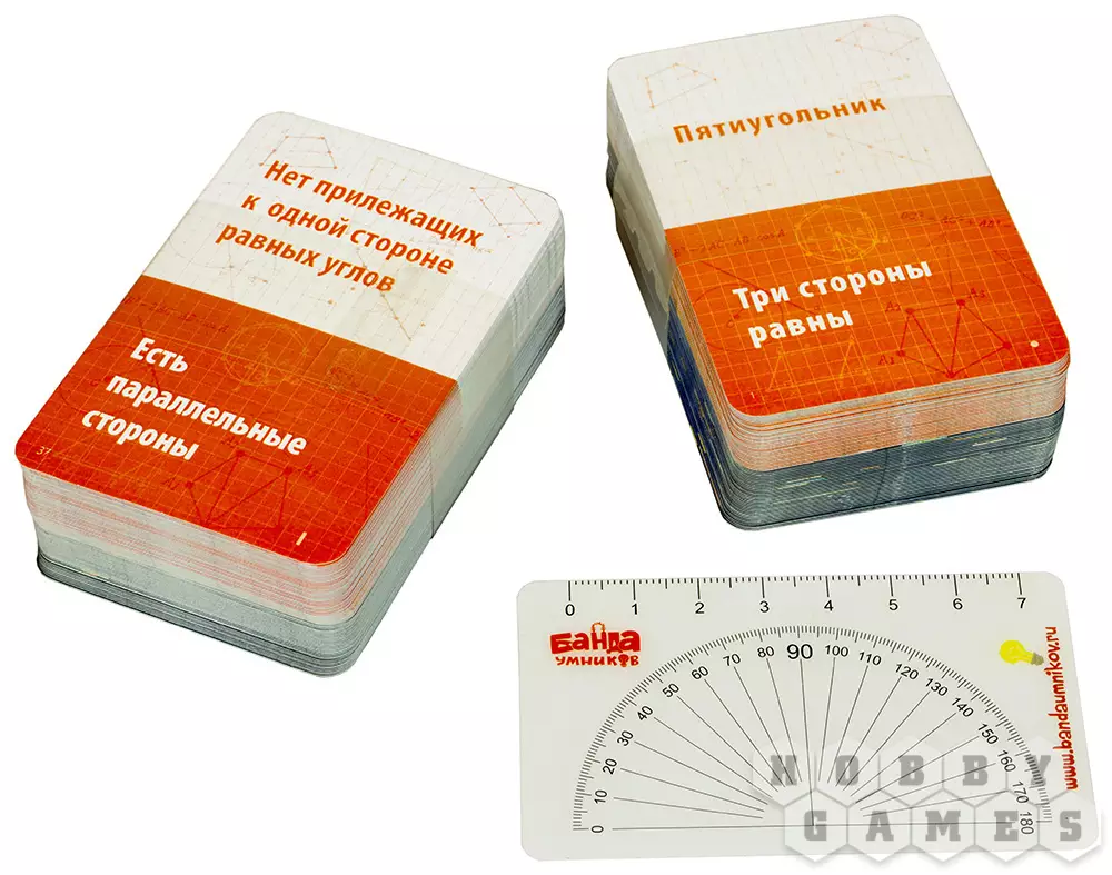 Выложите на стол пять карт с фигурами. А далее начинайте тянуть по одной карте с колоды признаков. Если на поле есть карта с фигурой, которой соответствует названный признак, (например, у прямоугольника "не все стороны равны"), тогда игрок берёт карту на руки. Далее ход переходит к другому игроку. Если кто-то из игроков не сможет найти фигуру, соответствующую признаку, то он сбрасывает все свои карты с руки. Чтобы избежать потерь, нужно время от времени собирать добычу, для этого после завершения хода игрок должен взять с руки несколько признаков и одну фигуру с поля, которая соответствует им всем. Теперь у него столько очков, сколько карт он выложил, а на поле на одну фигуру меньше.