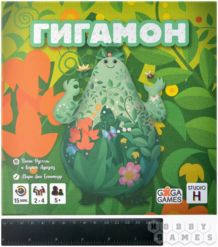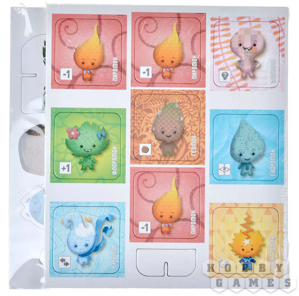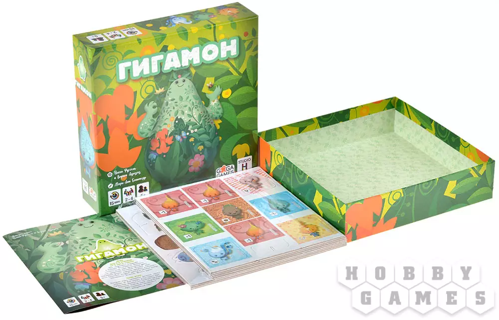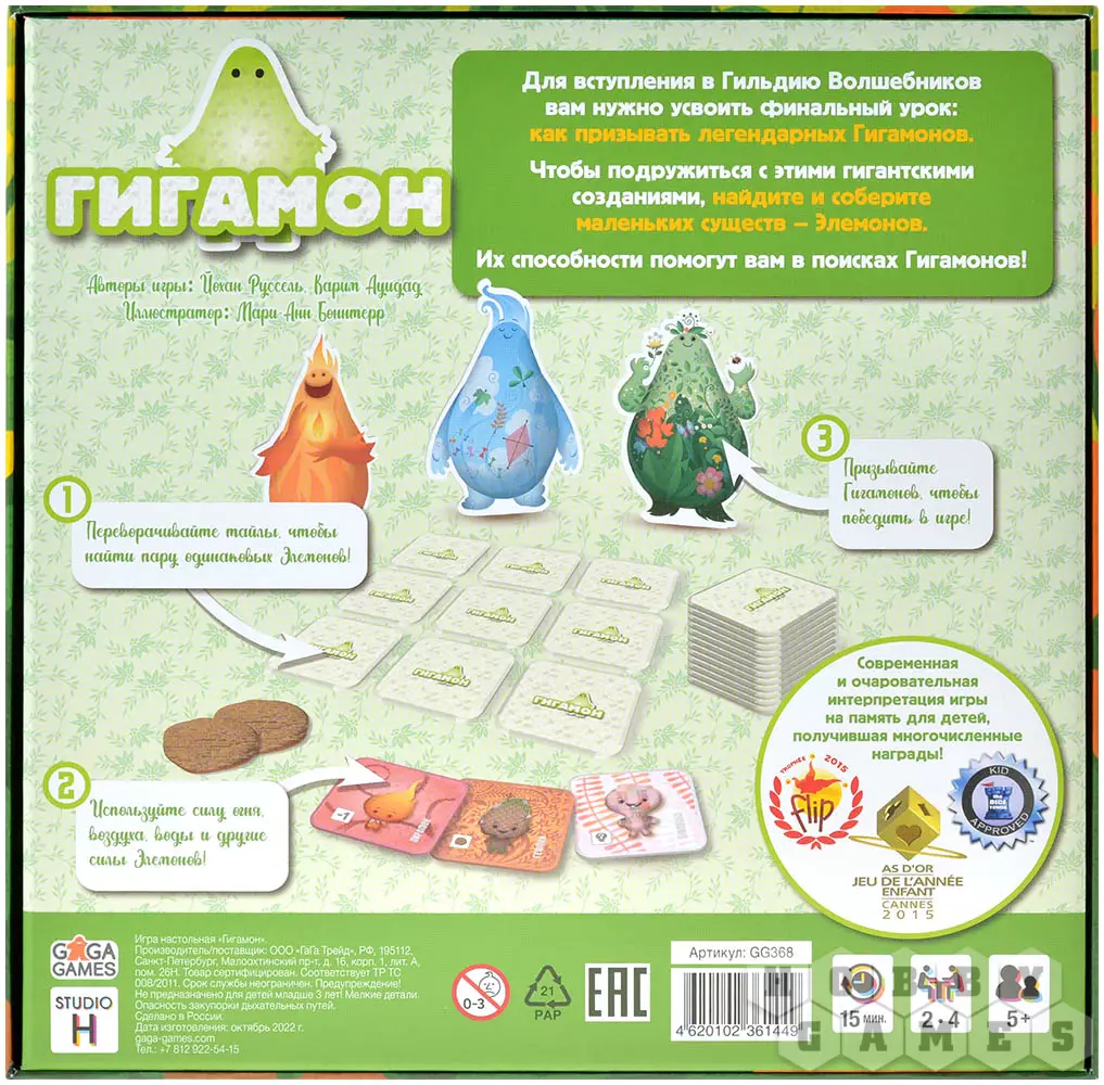 "Гигамон" – это простая и быстра игра на память. Выложите на столе поле 3x3 из тайлов элементов лицевой стороной вниз и начните игру! Игроки ходят по очереди, открывая по 2 любых тайла на столе. Если изображения на них совпали – заберите себе, а на их место выложите новые. Казалось бы, знакомая механика из игр типа мемори, но отличительной особенностью игры является возможность активировать особые способности собранных попарно Элемонов, которые будут давать вам некоторые преимущества. Как только вы соберёте три тайла с одинаковыми Элемонами, вы можете обменять их на Гигамона! Возьмите его из запаса или заберите у другого игрока.
