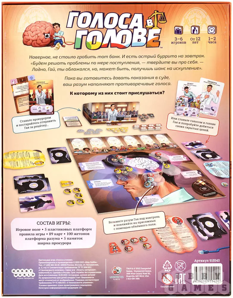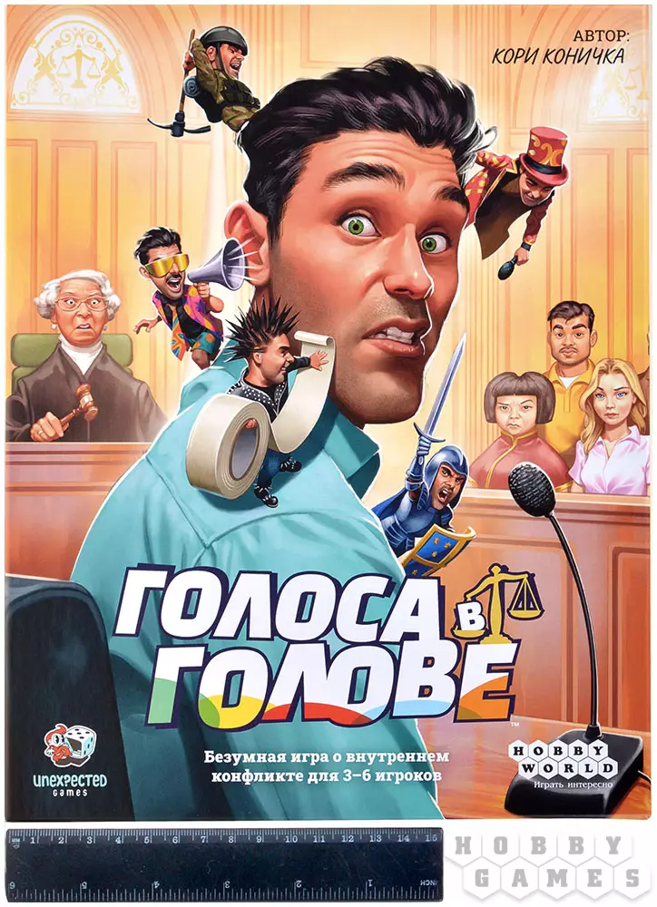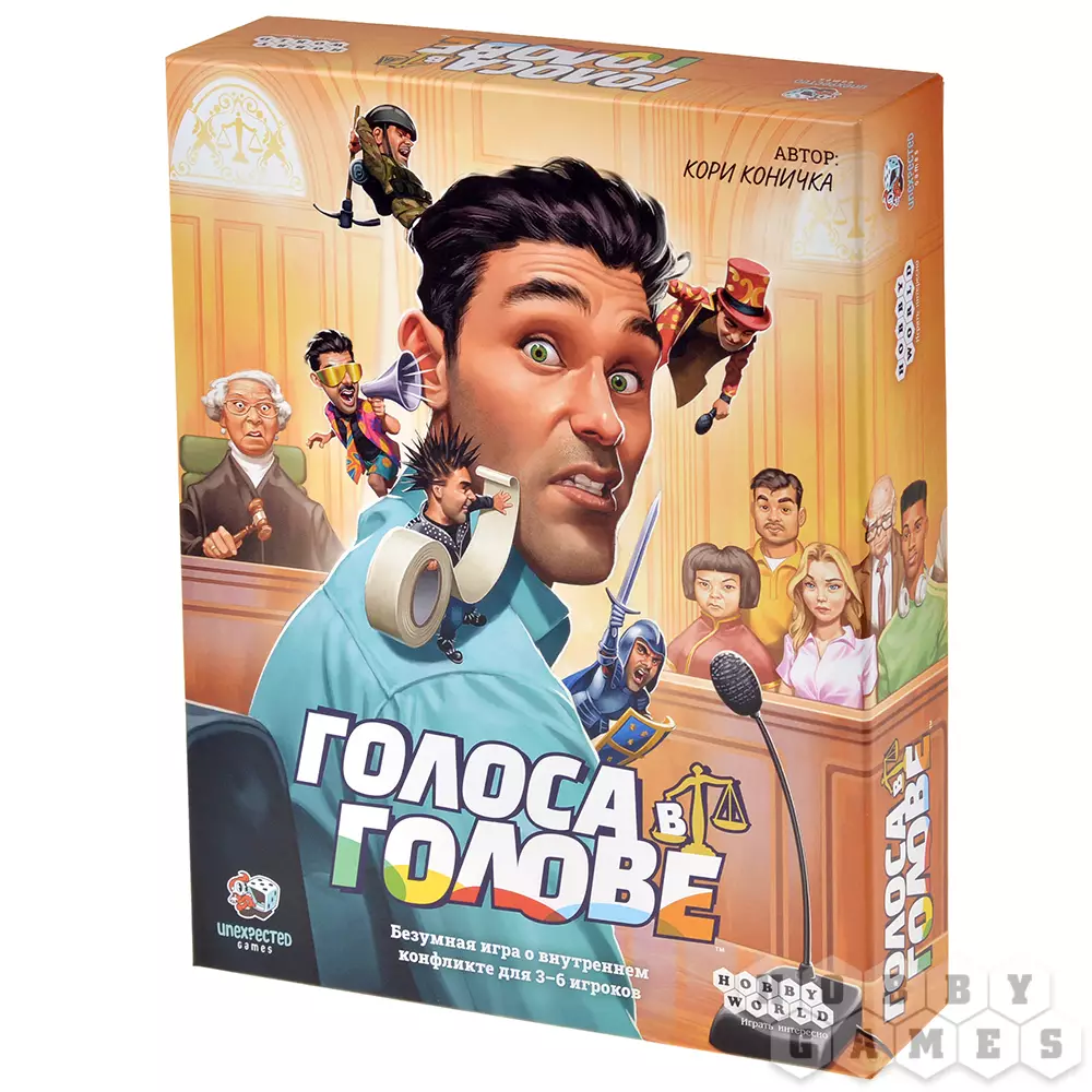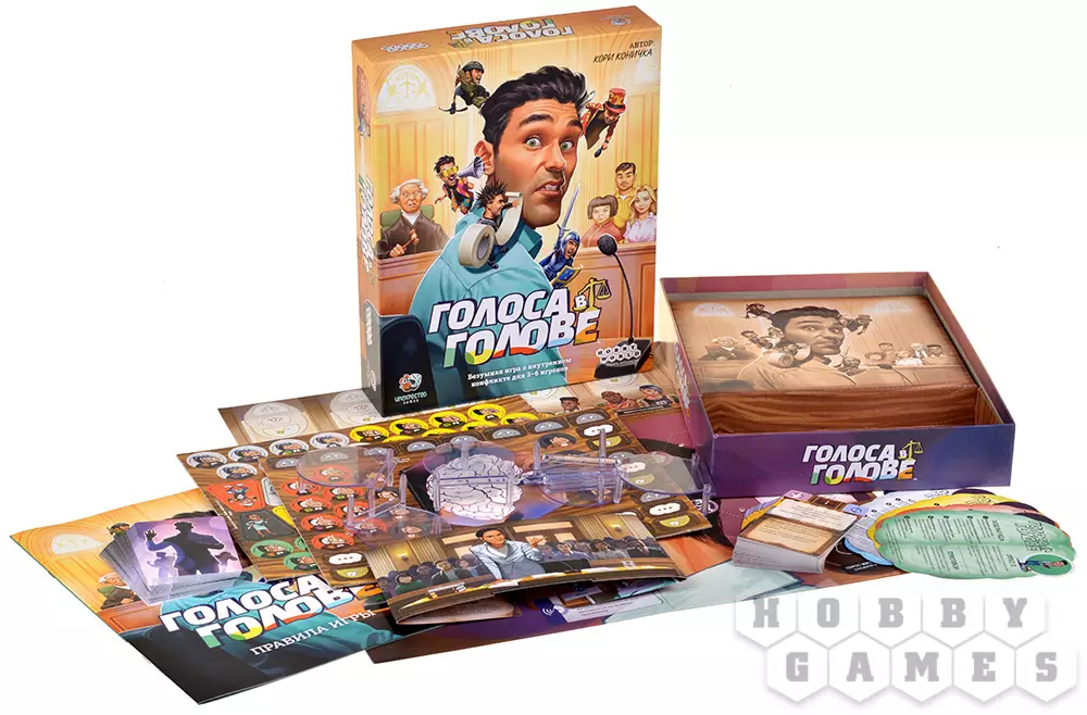 "Голоса в голове" – это настольная игра для компании от 3 до 6 человек с асимметричными тайными ролями. Ну, или почти тайными, ведь один из игроков берёт на себя роль прокурора, чьей задачей является доказать вину Гая Джонсона, в то время как остальные игроки выступают голосами в голове подсудимого, и каждый из голосов преследует свою цель, о которой кроме самого игрока не знает никто.
