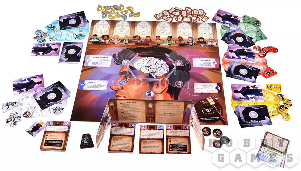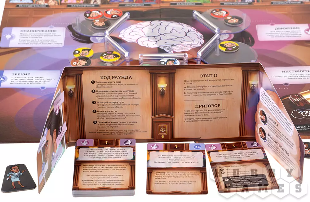 Игровое поле представляет собой различные области мозга Гая, за контроль над которыми игроки будут бороться, перемещая на них свои жетоны влияния (в том числе и прокурор). Так они смогут оказывать воздействие на присяжных и на ход судебного процесса в целом. Игра длится 8 раундов, после чего заседание заканчивается и зачитывается карта приговора.