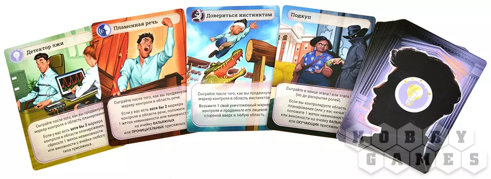 После розыгрыша карта суда отправляется в сброс, а прокурор добирает новую. За его ширмой всегда лежит 3 открытые карты, из которых он выбирает, какую разыграть.
