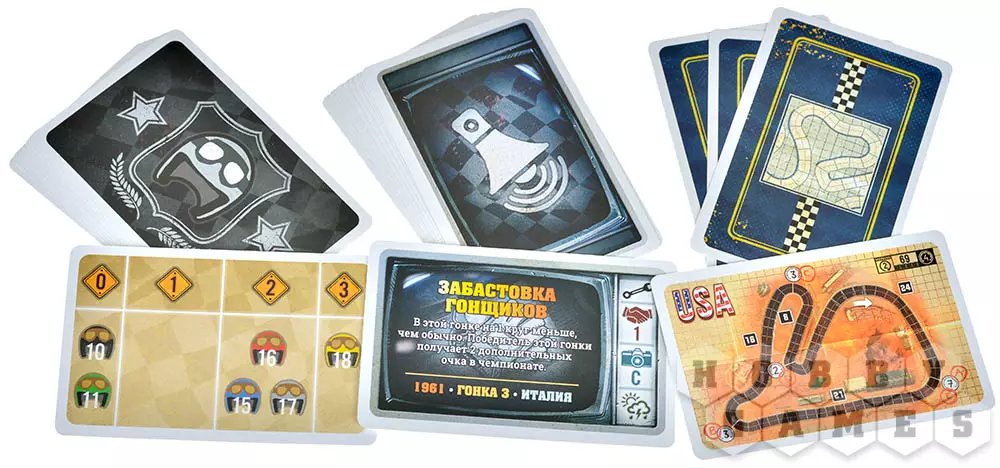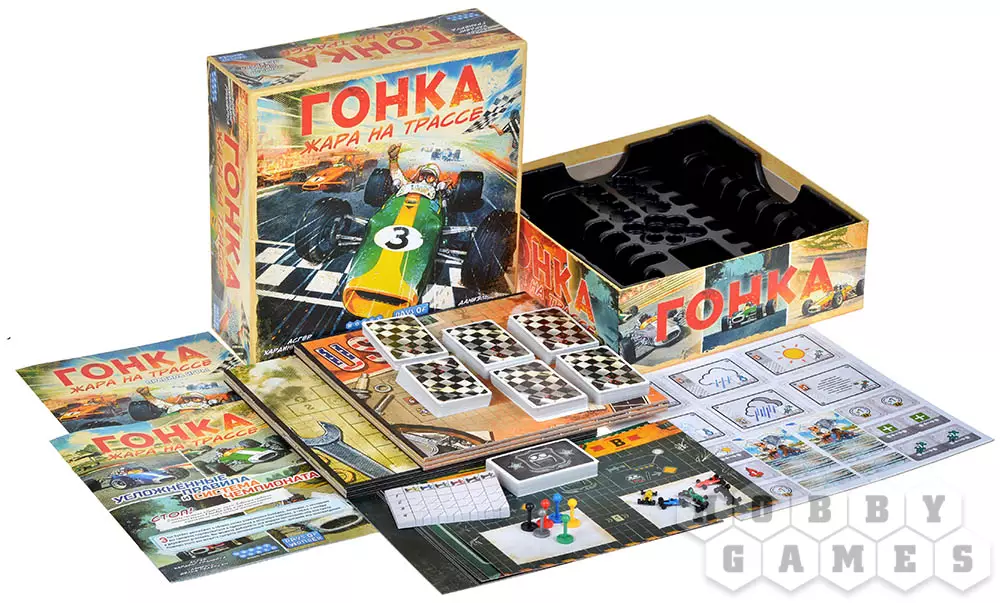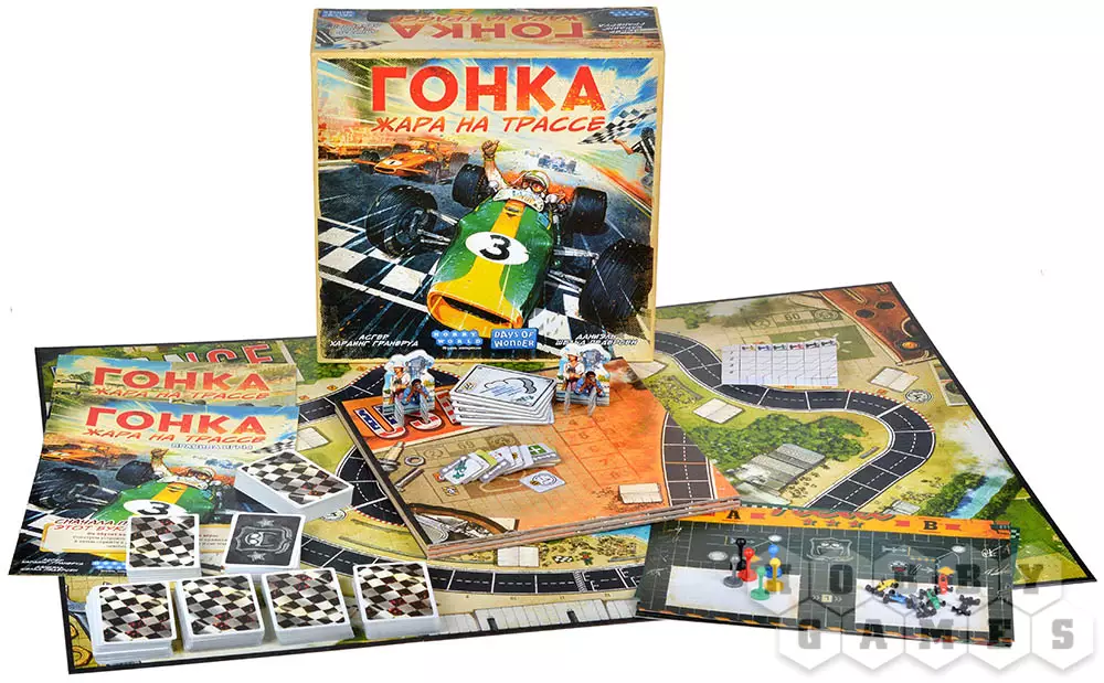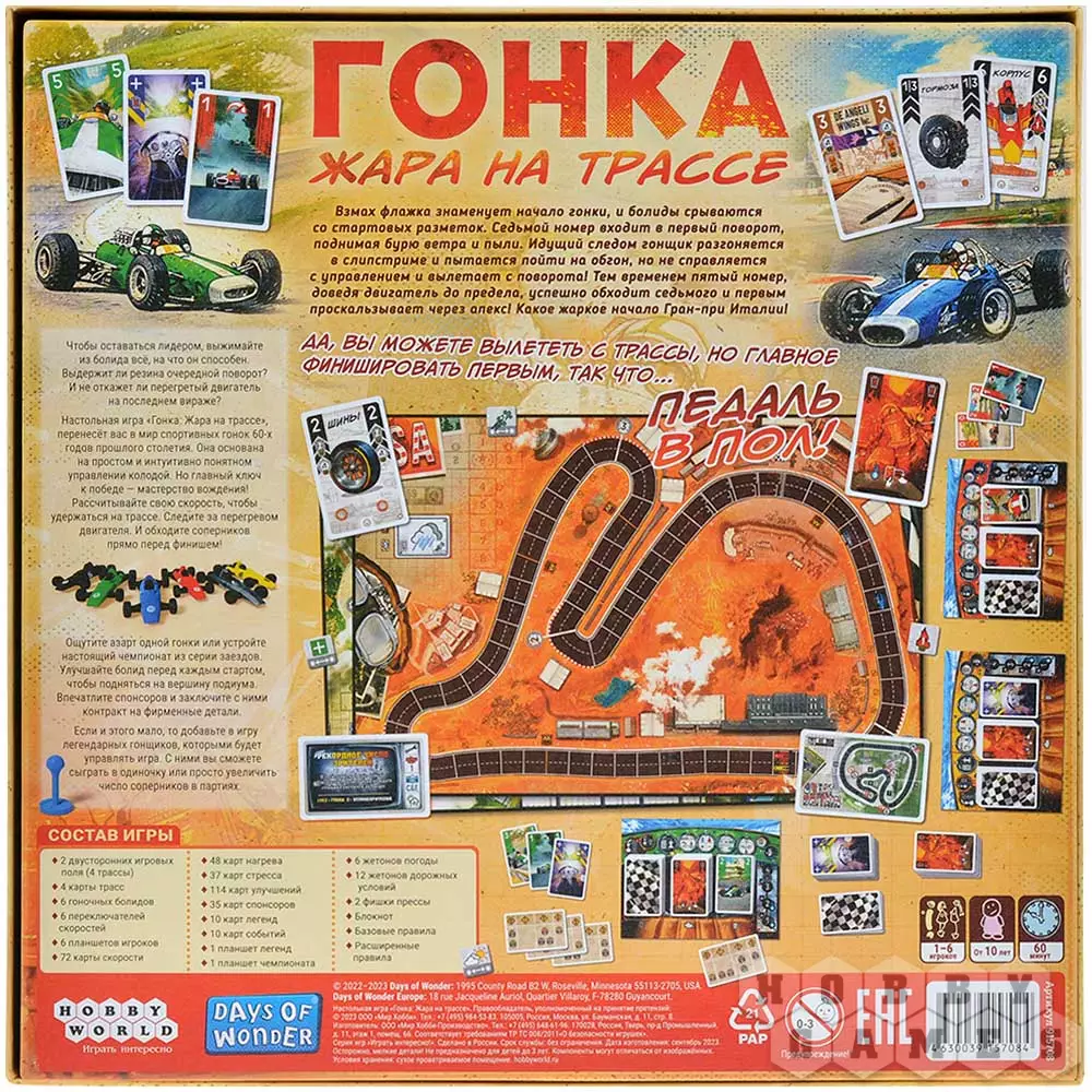 В настольной игре "Гонка: Жара на трассе" вас ждёт скорость, скорость и ещё раз скорость! Перенеситесь в мир автоспорта 60-х годов, сядьте за руль собственного болида и станьте героем всех гоночных треков! Но помните, что "газ в пол" – не единственная стратегия, которой нужно придерживаться: хватит ли резины на ещё один занос? Не накроется ли перегретый двигатель в самый неподходящий момент? Да и хватит ли вам квалификации?