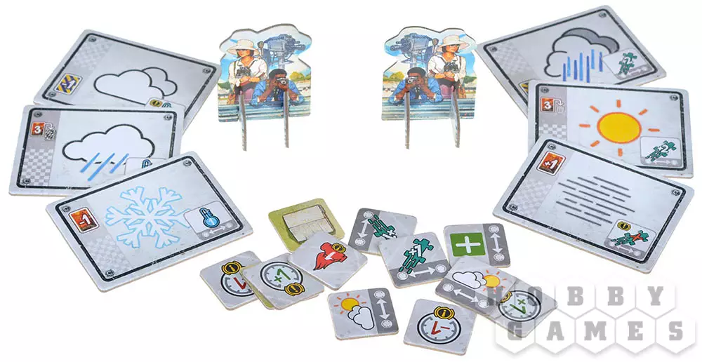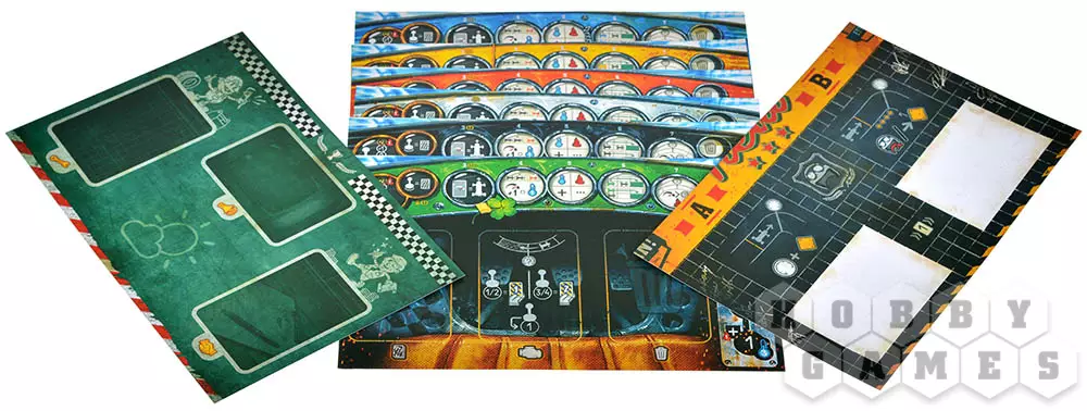 Выберите свой цвет и возьмите все компоненты этого цвета: болид, планшет игрока, переключатель скоростей, 12 карт скорости и 3 карты начальных улучшений. Дополнительно возьмите карты стресса и нагрева (их количество указано на карте трассы). Перемешайте полученные карты (кроме нагрева) и выложите составленую колоду в левую ячейку своего планшета, а карты нагрева в среднюю – это ячейка двигателя. Расположите болиды на игровом поле и возьмите из своей колоды 7 карт. Всё готово к гонке!