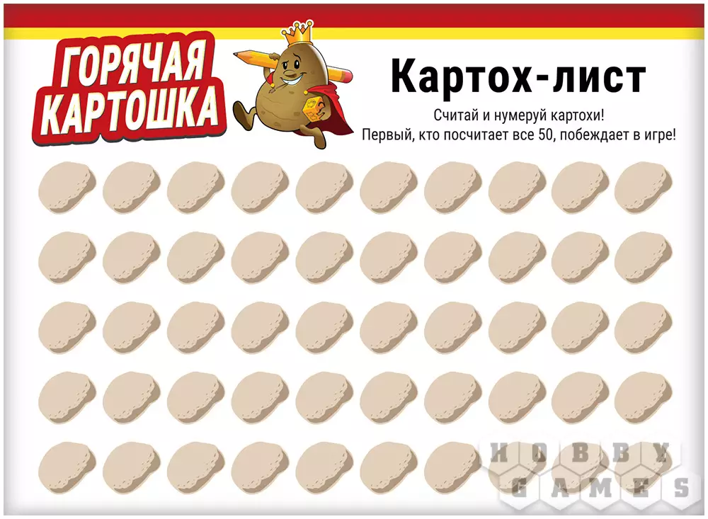 Игра завершается, когда один из игроков записывает последнюю, 50-ю картоху на своём листе. Нужно быть быстрым, ловким и находчивым, чтобы выполнить эту задачу раньше остальных! Бюро радостно поздравляет этого суперкартоховеда и торжественно вручает ему картох-наклейку!