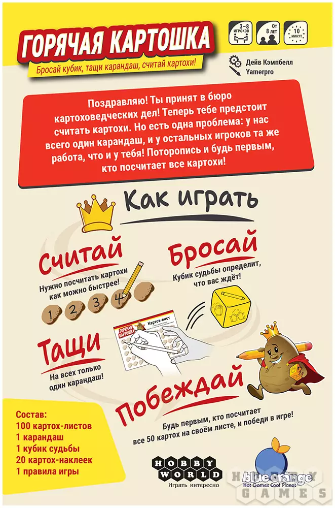 "Горячая картошка" – это детская настольная игра, играть в которую будет весело всей семье или же компании друзей! Вам придется проявить не только ловкость, но и скорость, чтобы опередить соперников!