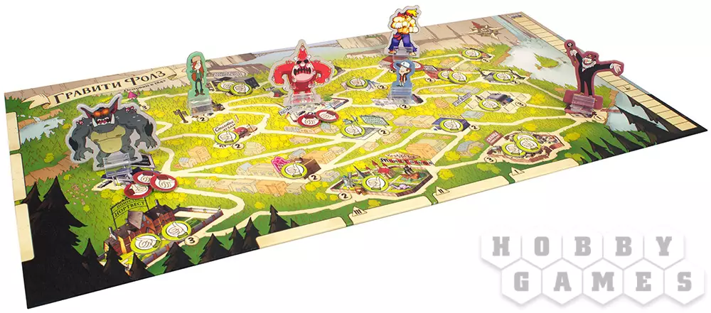 В этой кооперативной игре для 1 – 5 игроков вам предстоит путешествовать по Гравити Фолз, защищать его от монстров и убеждать горожан помочь вам. С каждым ходом от монстров всё больше бед, и доверие к игрокам падает. Чтобы не допустить этого, вам нужно победить их до того, как маркер тревоги достигнет предельного значения.