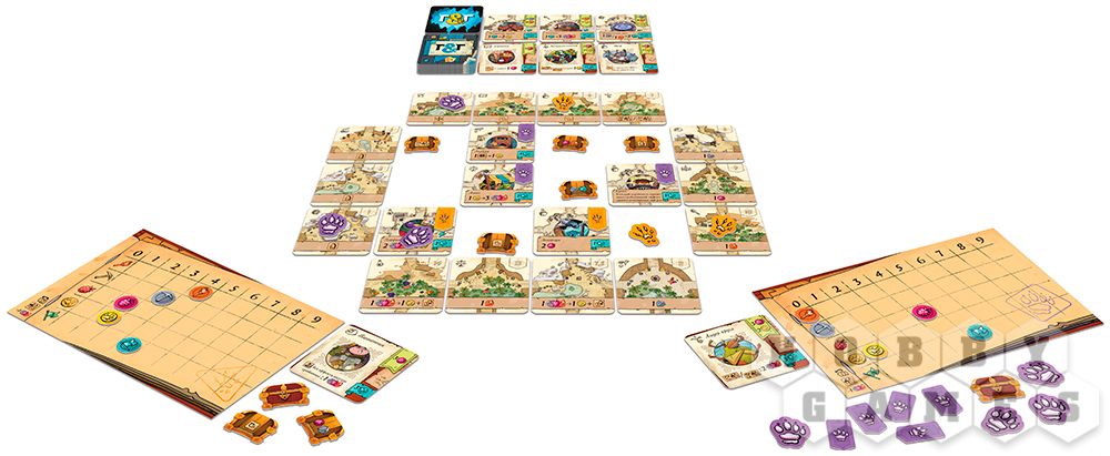 Для начала вы собираете игровое поле: выкладываете рамку из карт входов и наполняете её случайными жетонами сундука. Затем выбираете фракции грызунов, которые будут участвовать в приключении, и готовите жетоны и карты. Когда всё разложено, можно смело нырять в гробницу!