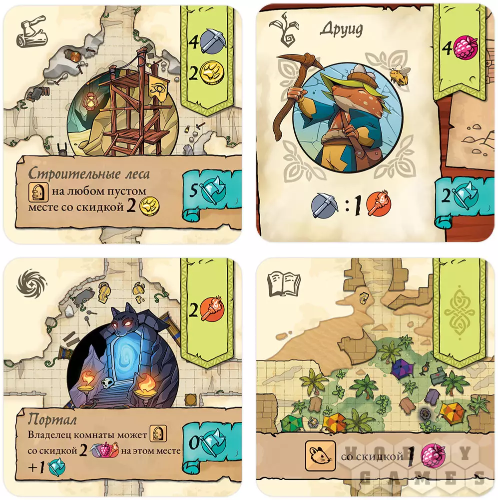 Самое интересное происходит, когда вы решаете собрать лапки назад. Снимая каждую по очереди, вы получаете то, что та принесла по эффекту карты: ресурсы, золото, помощников, возможность вскрыть новую комнату и другие полезные штуки. Главное – не копать в пустоту, иначе вернётесь ни с чем. Но если маршрут составлен удачно, одна активация может запустить цепочку приятных наград.