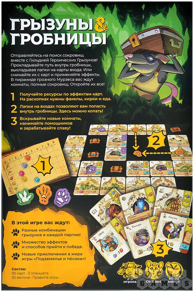 "Грызуны и гробницы" – это динамичная игра, которая перенесёт вас в загадочный мир древних пирамид. Ваша задача – быть быстрее соперников: прокладывать путь вглубь гробницы, активировать эффекты карт и собирать ценные ресурсы. Игра не даст вам заскучать ни на секунду, проверяя вашу смекалку!
