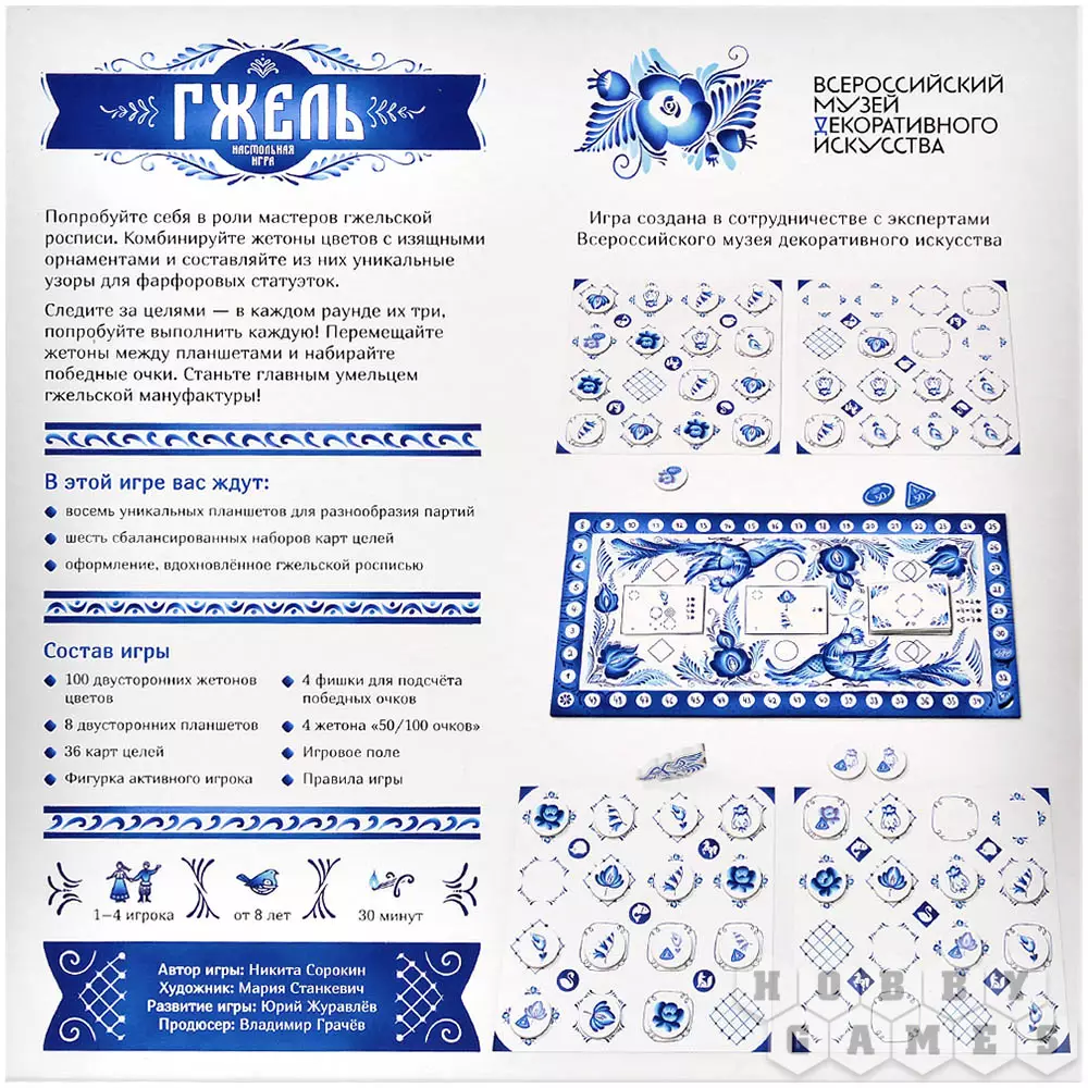 "Гжель" – это настольная игра, где каждый ход позволяет вам почувствовать себя настоящим мастером росписи. Игроки соревнуются за звание лучшего творца, комбинируя жетоны с цветами и орнаментами для создания красивых узоров. Игра предлагает уникальное сочетание стратегии и творчества, а также сближает с искусством, рассказывая чуть больше об истории русского народного творчества. Игра создана в сотрудничестве с экспертами Всероссийского музея декоративного искусства, а значит, глубокая связь с традициями и соответствие стилю гарантированы!