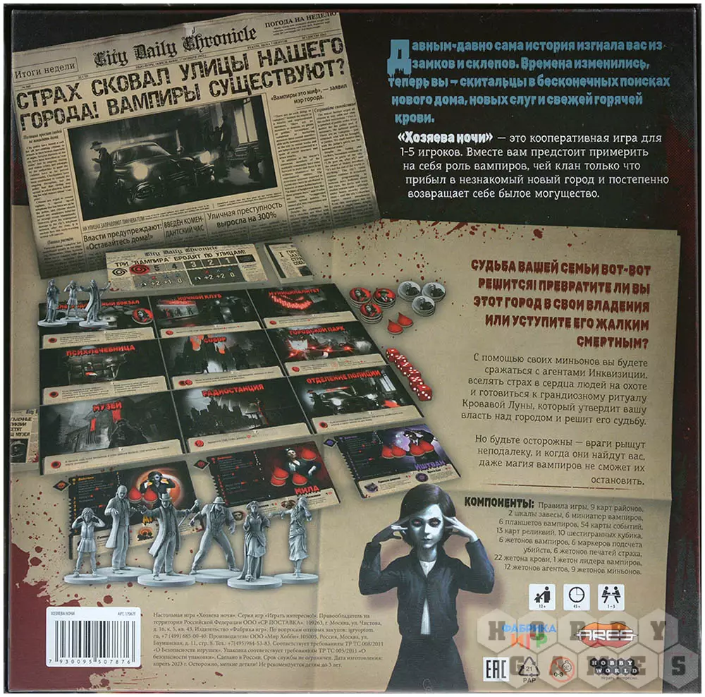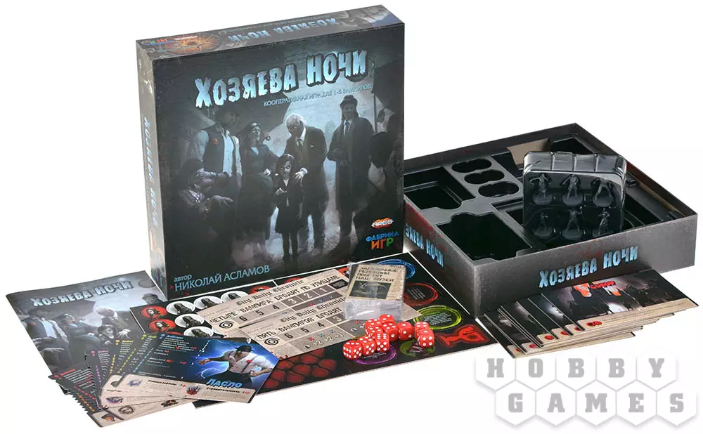 "Хозяева ночи" – это кооперативная настольная игра, где вы будете управлять вампирами, что желают подчинить своей воле город. Единственный способ сделать это – провести ритуал Кровавой луны, для которого вам придётся тщательно планировать действия, расправляться с агентами Инквизиции, перемещаться по городу и прибегать к магии. Днём вы будете скрываться от инквизиторов и наблюдать за городской жизнью, а ночью – выходить на охоту, вербовать приспешников и готовиться к ритуалу. Но время играет не на ваc: чем дольше вы колеблетесь, тем сложнее будет провести ритуал Кровавой луны, а потому не дайте загнать себя в угол и действуйте решительно!
