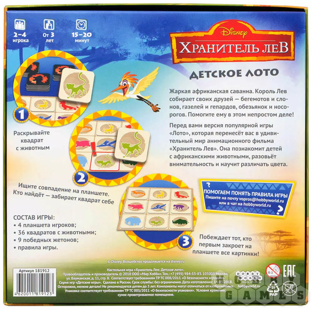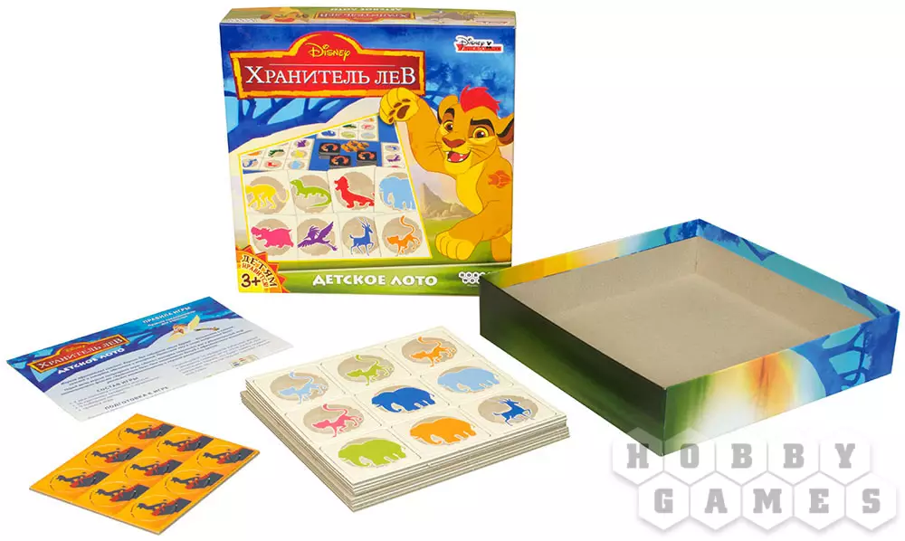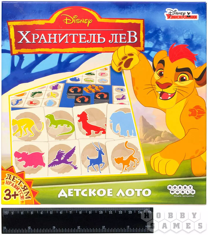 "Хранитель Лев. Детское Лото" – это специальная детская адаптация классической игры в лото, но с сильным развивающим уклоном, которая подойдёт для детей с трёх лет. Игра сделана по мотивам популярного и любимого детьми мультика "Хранитель Лев" от компании "Дисней" и поэтому порадует вас знакомыми персонажами и ярким дизайном.