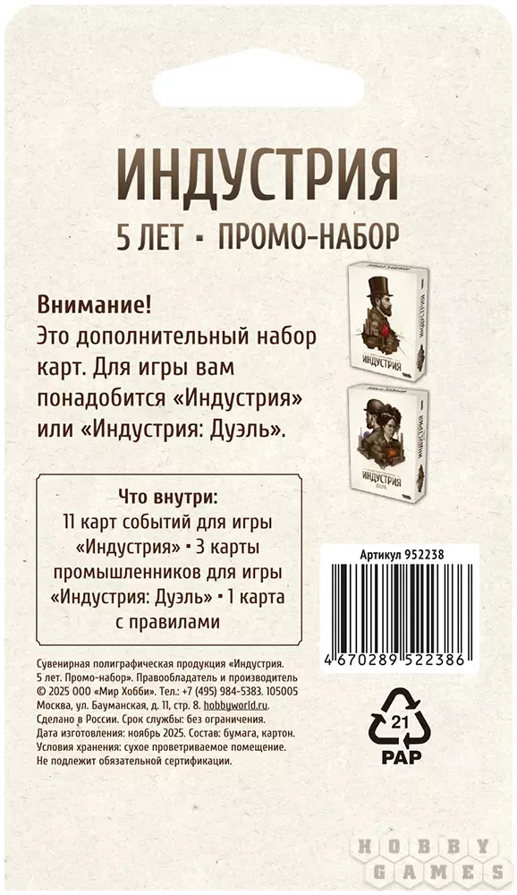 Внимание! Это дополнение. Для игры вам потребуется базовая версия "Индустрия" или "Индустрия: Дуэль". Этот конверт можно будет приобрести отдельно или получить бесплатно при покупке любой игровой продукции серии ("Индустрия", "Индустрия: Интербеллум", "Индустрия: Дуэль", "Индустрия: Набор ресурсов", игровой коврик "Индустрия", а также любых наборов, куда входят перечисленные товары).