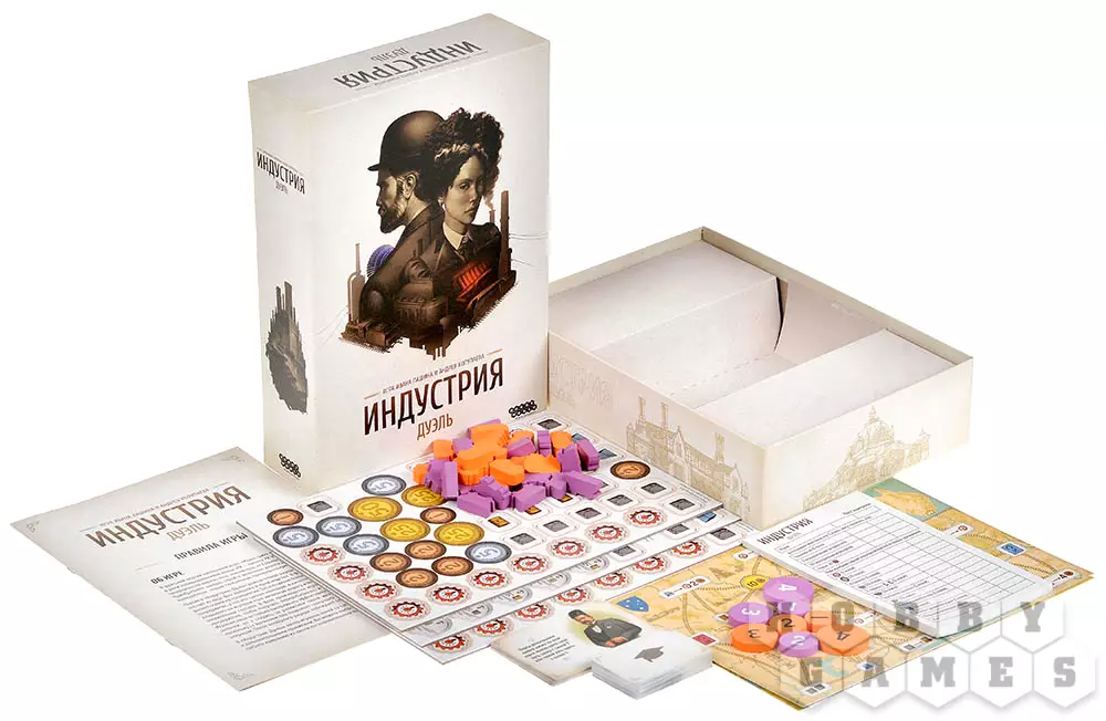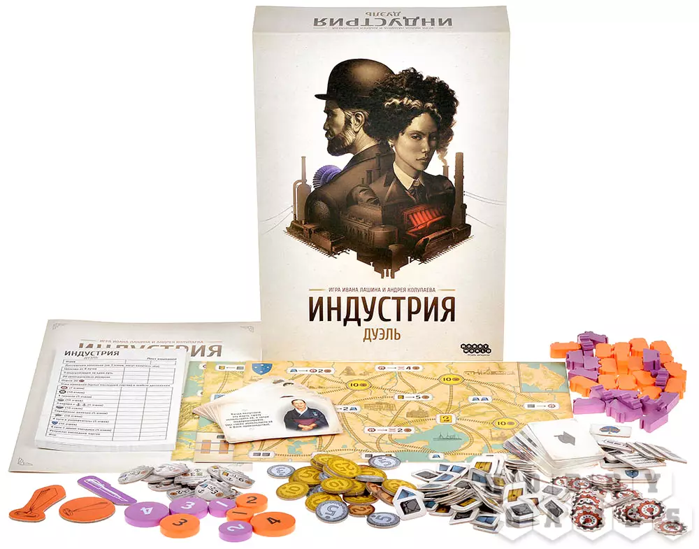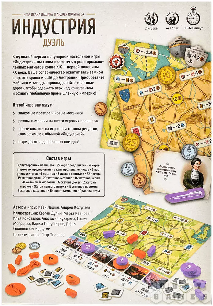 В дуэльной версии настольной игры "Индустрия", как и в оригинале, вы вновь возьмёте на себя роли промышленников. Но на этот раз вам предстоит не только приобретать заводы и производить ресурсы, но и прокладывать железные дороги по всему земному шару – от Европы и США до Австралии! В наборе вас ждёт целых 6 игровых полей со своими особенностями и дополнительными правилами: на партию можно выбрать любой из них, а можно сыграть целую кампанию из шести последовательных раундов.