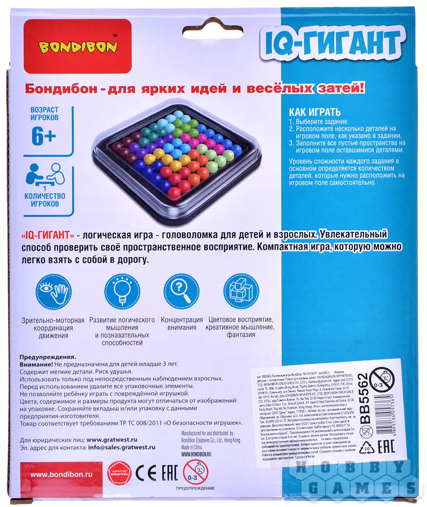 Головоломка "IQ-Гигант" представляет собой набор причудливых разноцветных фигур, собранных из множества шариков. Задача игрока – расположить фигуры на поле определённым образом согласно заданию. То есть, известен только конечный результат, к которому игрок должен прийти сам. Это увлекательная игра для детей, которая привлечёт внимание своей яркостью и необычными фигурами. Она отлично развивает пространственное мышление, концентрацию внимания и зрительное восприятие форм и объектов. 40 разнообразных заданий не дадут заскучать, а постоянно повышающаяся сложность задач натренирует полезные навыки ребёнка. Удобное поле с крышкой и компактный формат самой головоломки позволят легко взять её с собой в дорогу.