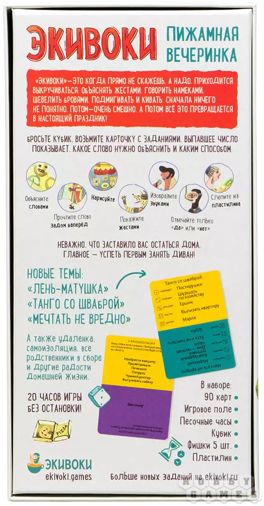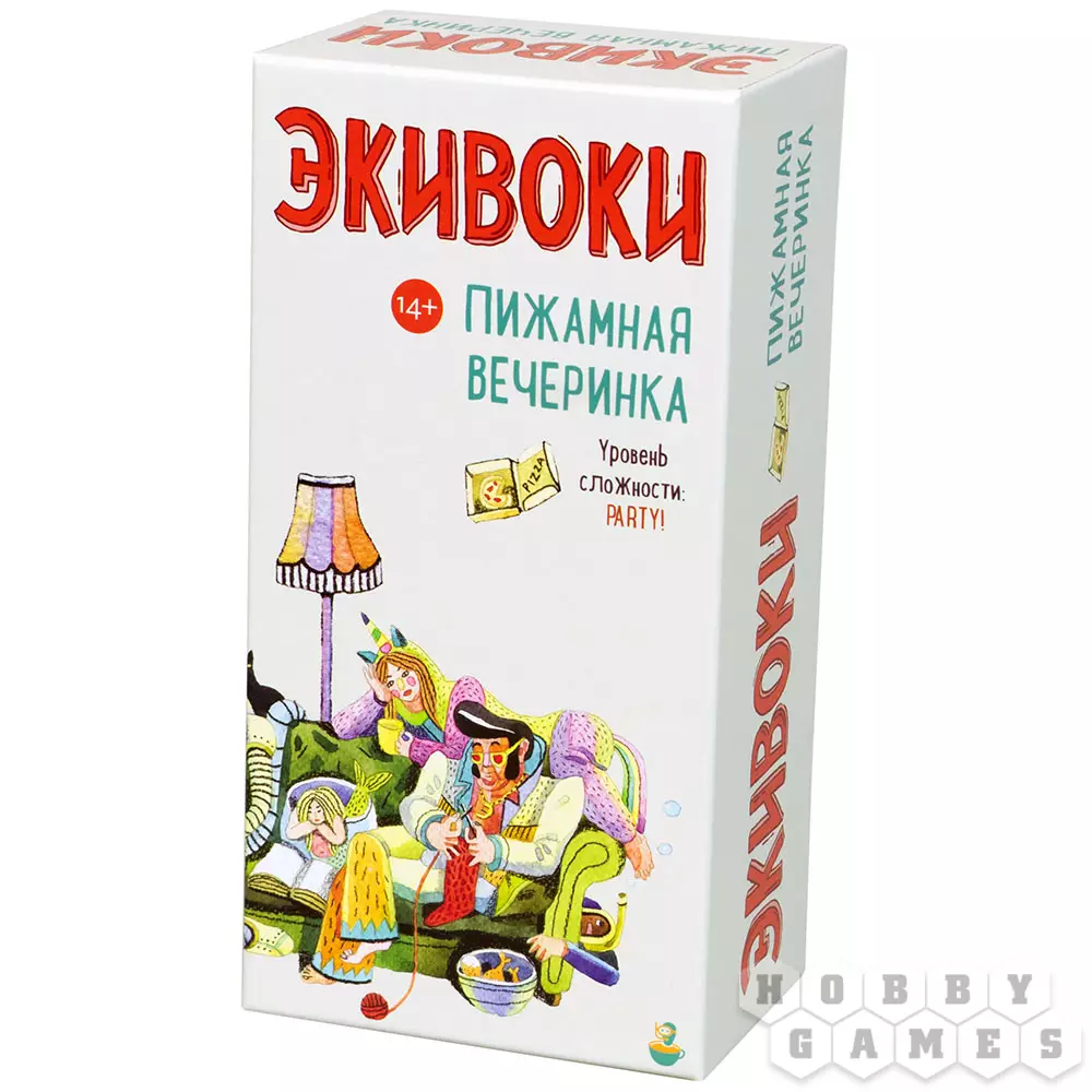 "Экивоки. Пижамная вечеринка" – это новая игра из серии "Экивоки", которая содержит 90 новых карточек со словами на темы "Мечтать не вредно", "Танго со шваброй" и "Лень-матушка". "Экивоки" – серия игр для компании, в которой нужно объяснять слова с помощью пения, рисования, лепки из пластилина и других интересных способов. А ключевой момент, который привлекает любителей патигеймов – это слова на карточках, старательно подобранные разработчиками игры, чтобы сделать вашу игру максимально уютной и весёлой. Игра посвящается времени, проведенному в стенах дома, независимо от того, что послужило для этого причиной: интроверсия, болезнь или просто леность. Да и какая разница? Главное поскорее занять стратегическую позицию – диван. В коробке вы найдёте всё необходимое для игры, добавить нужно только аксессуары для рисования, например, карандаш и чистый лист бумаги. Игра рекомендуется вместе с "Экивоки. Мама запретила" и хорошо сочетается с другими играми серии "Экивоки".