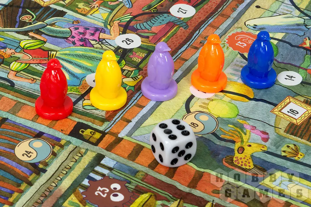 Ваша задача – провести свою фишку от дверей дома до чердака быстрее, чем соперники. Перед игрой вы должны решить, по какой стороне карт играете, по синей или оранжевой. Всё просто: бросьте кубик, выполните задание, пройдите вперёд. Задания заключаются в том, чтобы объяснять и отгадывать слова тем или иным способом. В зависимости от выпавшей грани кубика вы можете получить следующие задания:
