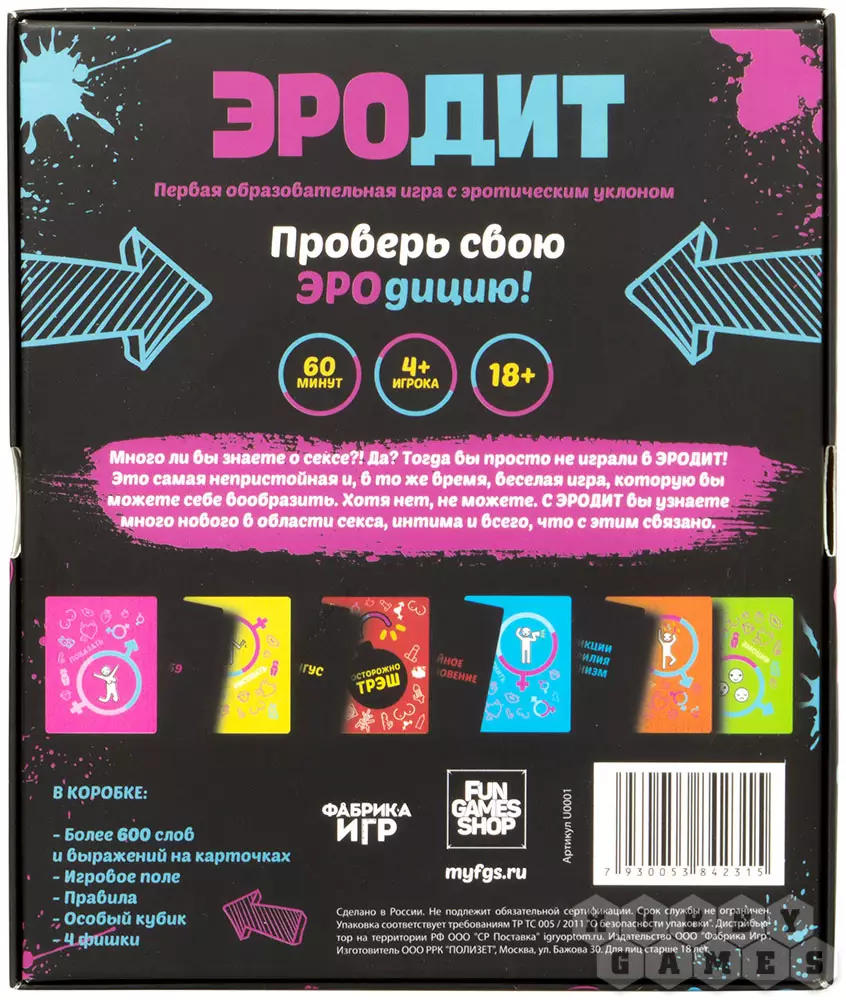 Перед вами "Эродит" – весёлая настольная игра для шумной взрослой компании. И хотя никакого тесного контакта в игре не предусмотрено, детей лучше держать подальше. Здесь вам предстоит, разделившись на команды, объяснять друг другу различные слова и словосочетания несколькими различными способами.