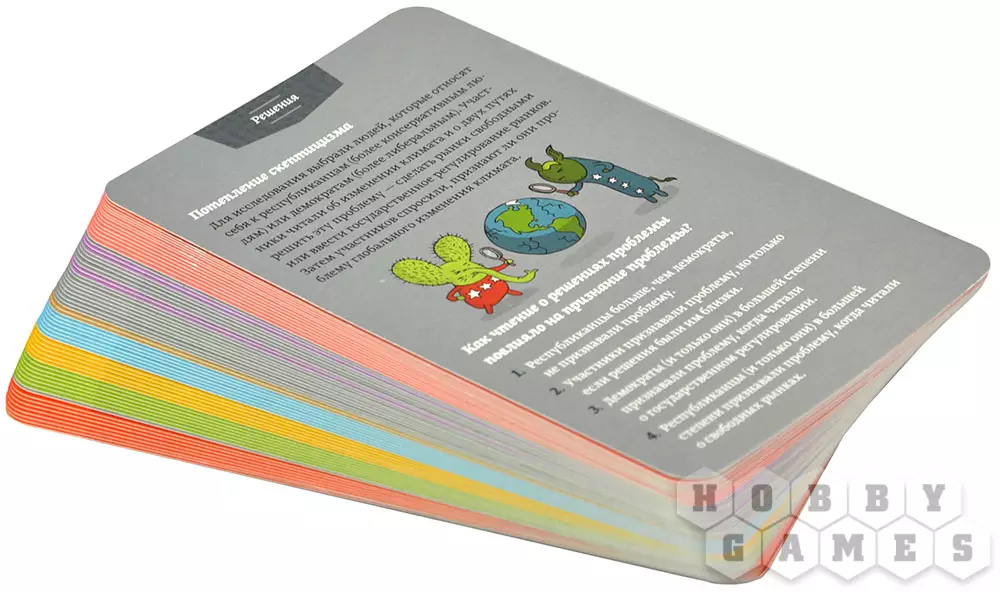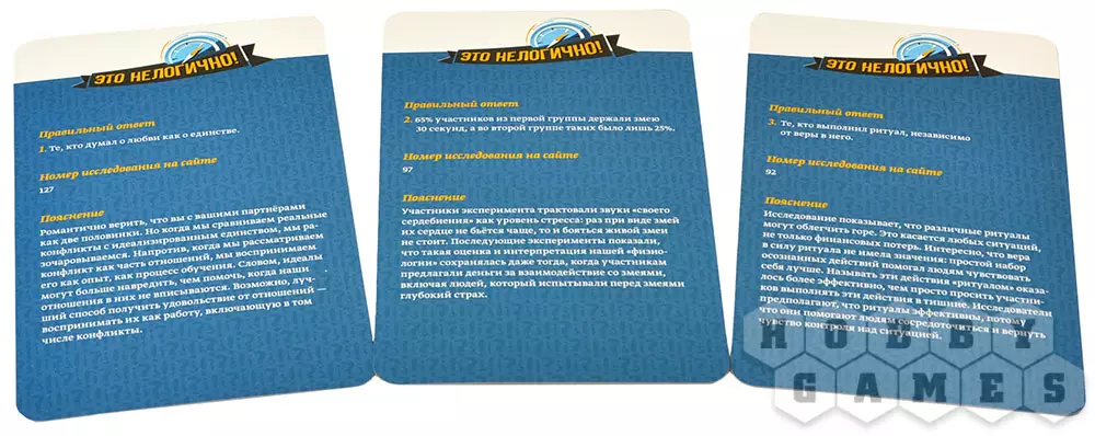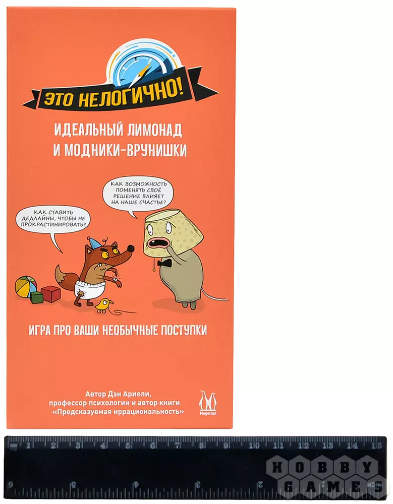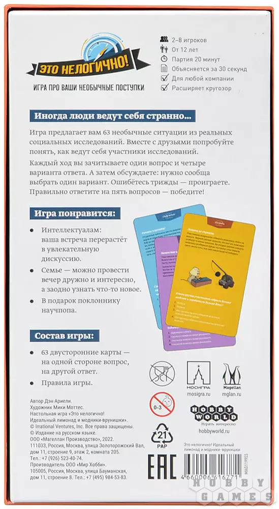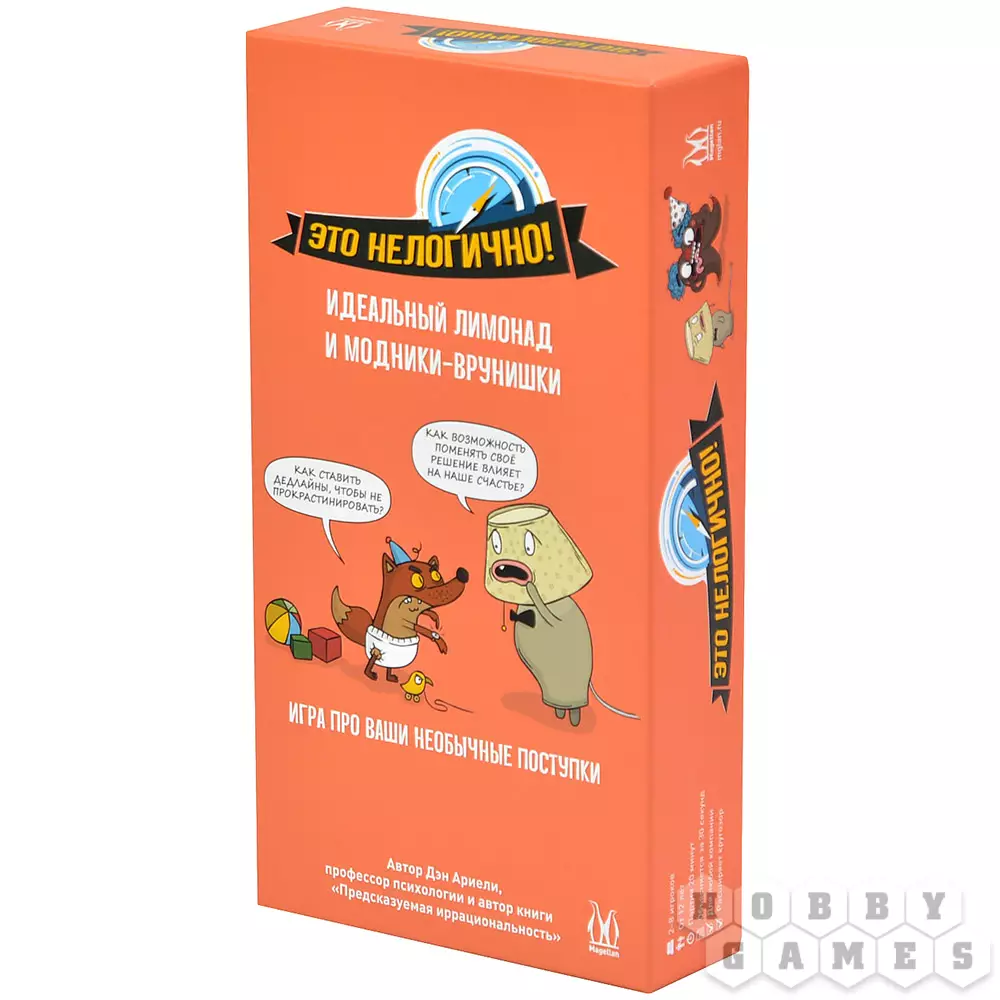 "Это нелогично! Идеальный лимонад и модники-врунишки" – это карточная настольная игра, основанная на настоящих социологических исследованиях. В коробке 63 карты, вам и вашим друзьям предстоит проанализировать ситуации, описанные на карточках, и постараться понять, как повело себя большинство участников исследования: четыре варианта ответа на один вопрос. Трижды ошиблись? Увы, вы проиграли. Дали 5 правильных ответов – вы выиграли! Но если всё-таки трижды ошиблись, не расстраивайтесь и попробуйте ещё раз.