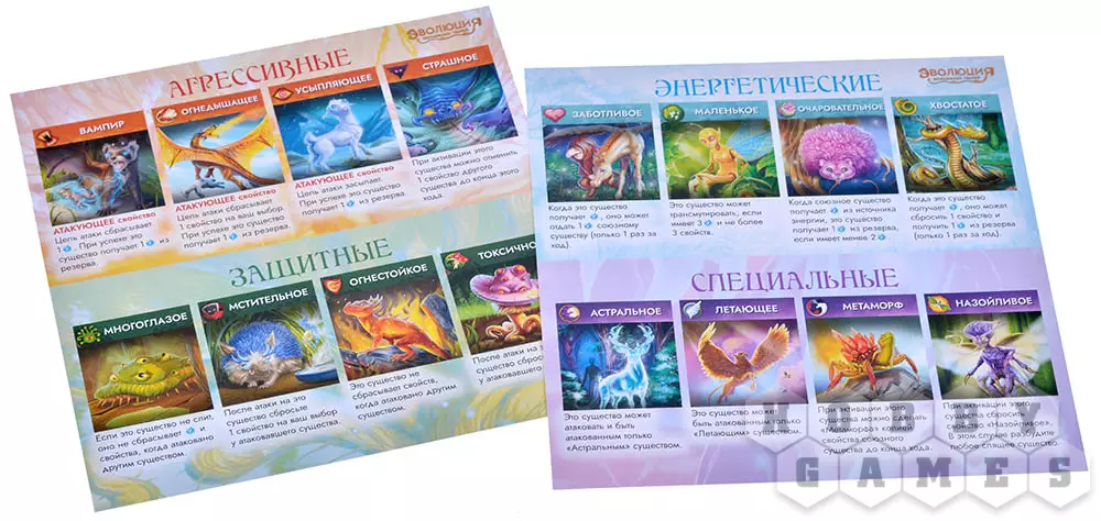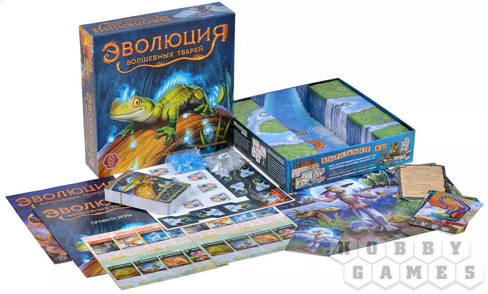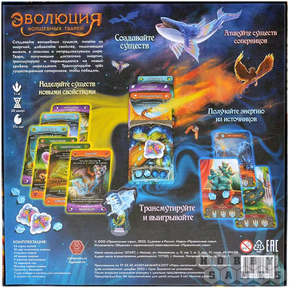 "Эволюция волшебных тварей" – это продолжение и переосмысление хитовой игры "Эволюция". Как и в оригинале, ваша задача – развивать своих существ, делая их всё более совершенными и добавляя им уникальные свойства. Каждый игрок управляет развитием конкретного волшебного существа, наделяя его способностями и изменяя по мере необходимости. В отличие от классической игры, здесь для победы не нужно набрать больше всех победных очков, а ваши существа не могут умереть – в определённый момент они трансмутируют, превращаясь в новые виды! Победит игрок, что первым трансмутирует существо трижды.