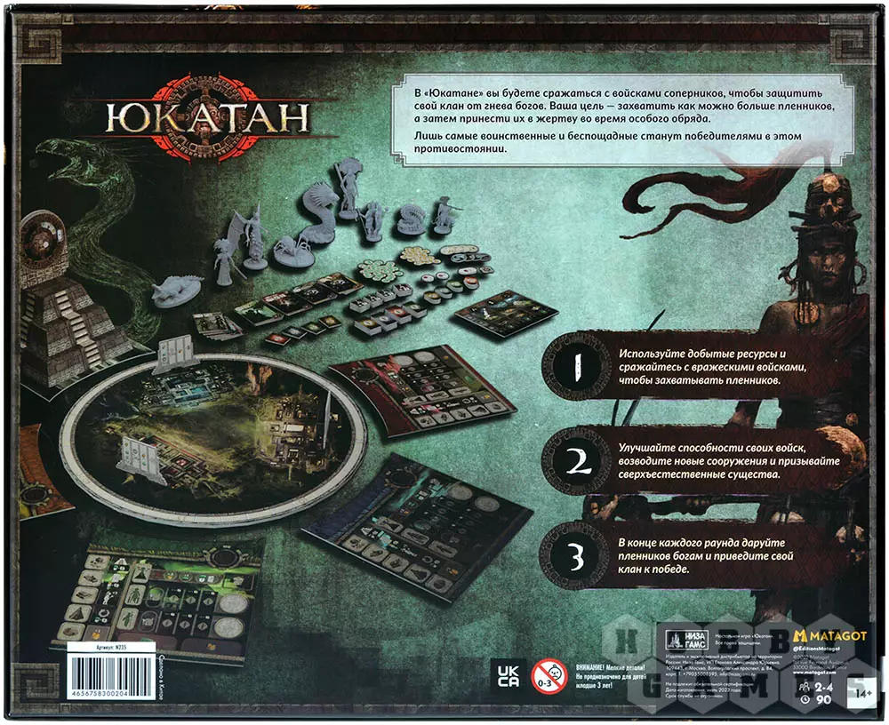 "Юкатан" – это настольная игра с механикой контроля территорий. В ней вам предстоит контролировать один из кланов народа майя и сражаться с армиями соперников, дабы защитить свой народ и свой город от гнева богов. В процессе атак вы будете брать в плен вражеских воинов с целью принести их в жертву во время особого обряда. Успешные ритуалы принесут вам немало выгоды, но и соперники тоже не будут стоять на месте: одной из особенностей "Юкатана" является то, что игрокам выгодно становиться мишенью других игроков, ведь проигравший бой получает определённые бонусы.