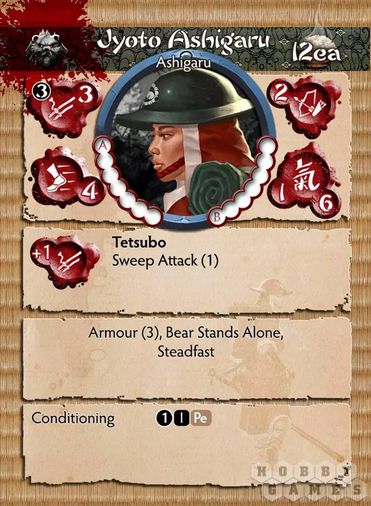 Все Jyoto Ashigaru облачены в тяжелую броню, каждый костюм индивидуально подогнан под конкретного солдата. У них есть тяжелый металлический Tetsubo, для использования которого большинству мужчин нужны две руки (хотя некоторые из Minimoto легко размахивают им одной рукой или даже владеют сразу дубинами!). С помощью него они неустанно тренируются, чтобы наращивать свою силу. Они составляют основную часть сил Minimoto, каждый из них начинал свою карьеру в армии неудачником, но проявив себя, они смогли вступить в ряды Jyoto Ashigaru.