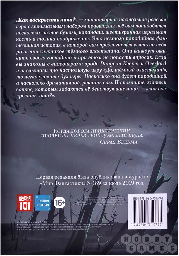 Именно за них вы и будете играть в "Как воскресить лича"! Это миниатюрная ролевая игра, что означает, что правил здесь будет сильно меньше, чем в "полновесных" ролевых. Создание персонажа займёт всего несколько минут. В начале игры каждый игрок выбирает одного из приспешников – это может быть скелет, мантикора, крыса, тёмная эльфийка, желатиновый куб или гоблин. Кроме этого нужно придумать имя персонажа, выбрать его сильную сторону, личную цель и тайное число – и всё, ваш тёмный приспешник готов! Только не забудьте, что игра в первую очередь сатирическая – что, впрочем, нисколько не умаляет серьёзность вашей миссии.