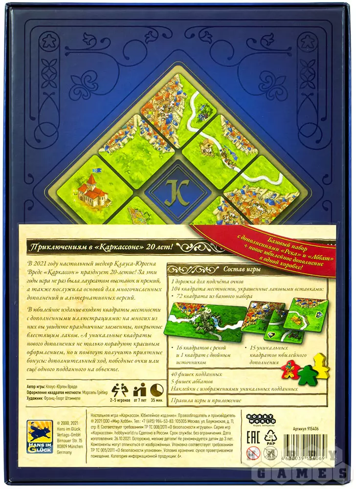 Настольная игра "Каркассон" не нуждается в представлении. Вот уже 20 лет творение Клауса-Юргена Вреде радует самых заядлых настольщиков и продолжает покорять сердца новых, ещё неопытных игроков. 20 лет, вы только задумайтесь! Именно столько в 2021 году исполняется шедевру от мира настольной индустрии, который имеет полное право называться таковым: за прошедшие годы "Каркассон" неоднократно становился лауреатом всевозможных премий и выставок; а сколько дополнений и альтернативных версий было сделано на его основе? Да просто не сосчитать!