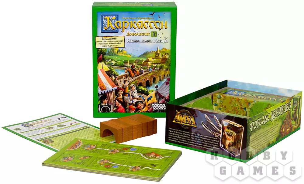 "Мосты, замки и базары" – восьмое дополнение к знаменитому "Каркассону", в котором вы сможете улучшать осваиваемые территории, выставляя на них фишки мостов, как уже было рассказано. Также на месте малых городов можно с лёгкостью построить собственный замок и собрать неплохую прибавку к победным очкам за завершённый впоследствии объект. Ну и ко всему вышеперечисленному, вы сможете вести с другими игроками торги на базаре за квадраты территорий, и, в случае удачного приобретения, получить впоследствии дополнительные очки.