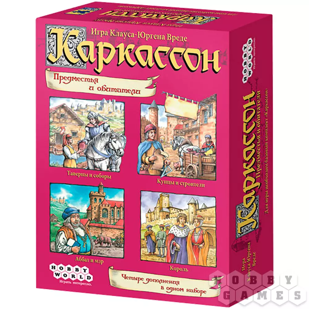 В новой серии "Каркассон. Предместья и обитатели" включены дополнительные фишки, тайлы и аддоны. Среди них: "Купцы и Строители" ( Traders and Builders), "Таверны и соборы" (Inns and Cathedrals), "Аббат и мэр" ( Abbey & Mayor), "Разведчик" (Scout) и, конечно же, "Король" (King). Набор "Разведчик" можно использовать лишь в разделе "Охотники и Собиратели". Остальные наборы можно использовать, как пожелаете – вместе с ними игра станет еще богаче и интереснее!