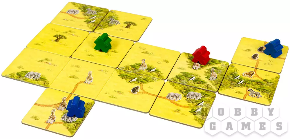 По ходу игры, как и в классическом “Каркассоне”, игроки по очереди выкладывают тайлы, ход за ходом составляя карту местности, включающую в себя различные объекты: тропы, заросли, саванну и баобабы. На каждый элемент можно отправить своего рабочего, заняв таким образом объект. Чем больше на этом объекте различных видов животных, тем больше очков сможете получить. Важно помнить, что рабочих всего лишь шесть, так что борьба за самые лакомые уголки неизбежна. Чтобы забрать работника и получить очки, ваш объект должен быть “завершён”: например, тропа должна иметь начало и конец, а заросли должны стать замкнутым пространством.