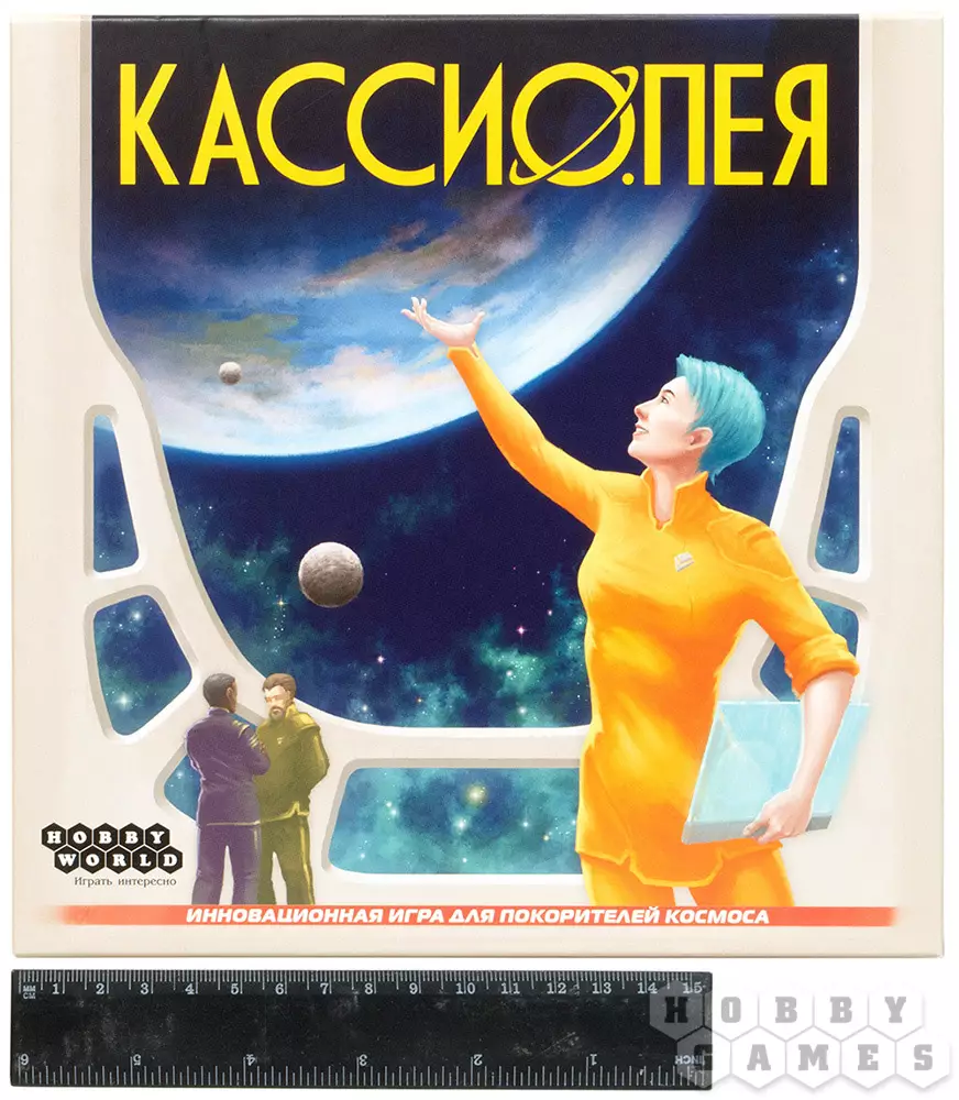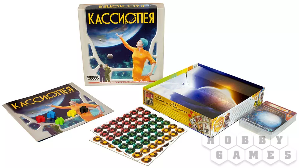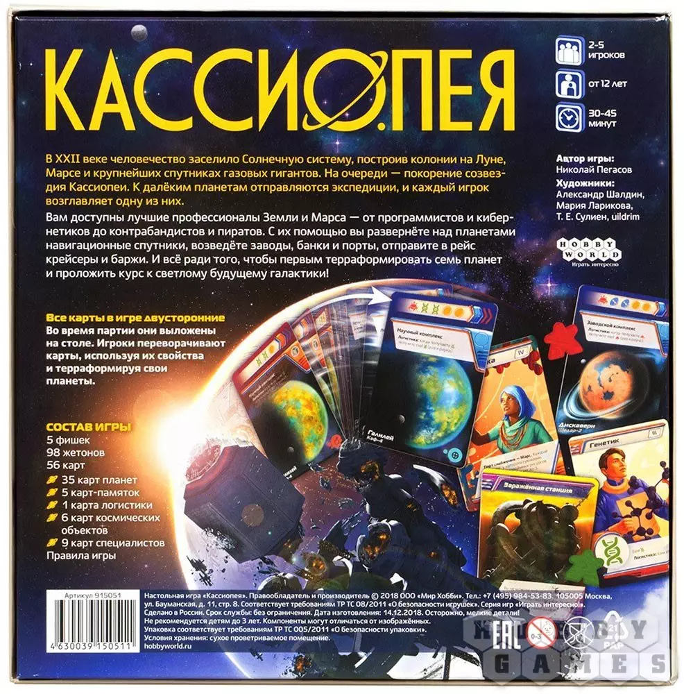 "Кассиопея" – это экономическая карточная игра для 2-5 игроков в научно-фантастическом сеттинге. Добравшись до своих систем в созвездии Кассиопея, каждый игрок старается как можно быстрее терраформировать все семь доступных ему планет, каждая из которых обладает определённым эффектом, для получение которого планету сначала нужно "озеленить". Для этого вам предстоит добывать различные ресурсы (монеты, боты, линзы, клетки и капсулы), а также эффективно пользоваться услугами специалистов, которые отправились в экспедицию вместе с вами. Их набор каждый раз случаен, что делает партии более разнообразными. Всего доступно девять карт (18 специалистов): биолог, инженер, кибернетик, контрабандист, марсианка и т. д., каждая карта со своим уникальным эффектом.