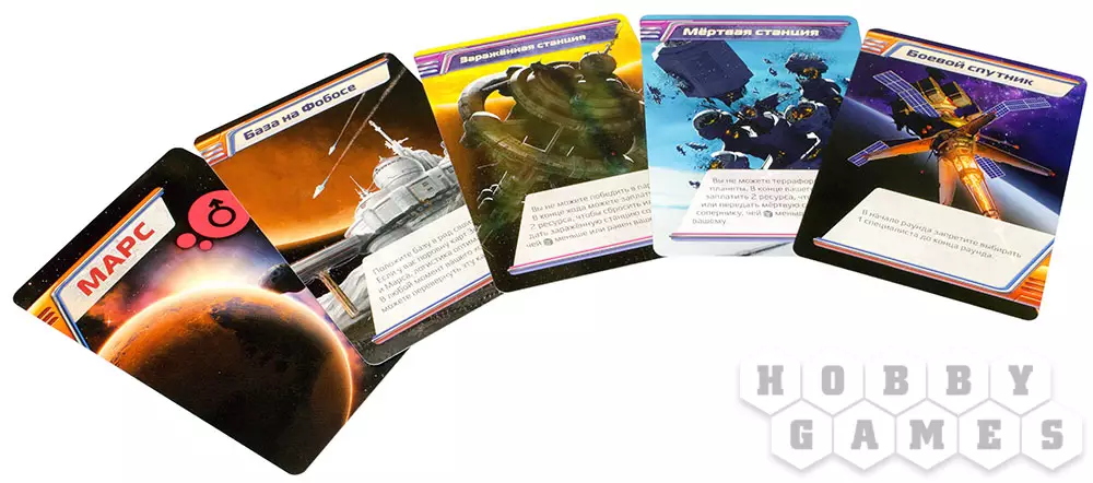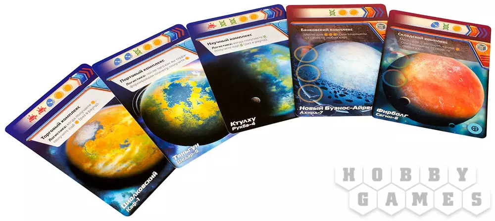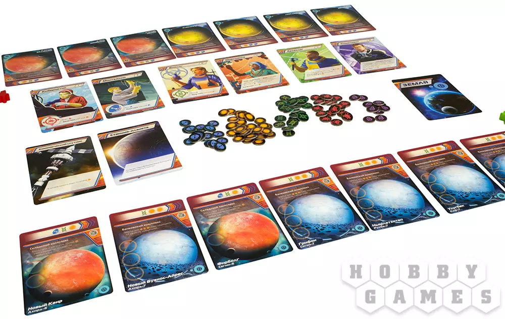 Каждый игрок получает набор из семи планет, которые ему предстоит терраформировать. Карты лежат в ряд, и цена терраформинга планеты указана на соседней слева карте – таким образом даже цены в игре будут отличаться из партии в партию.